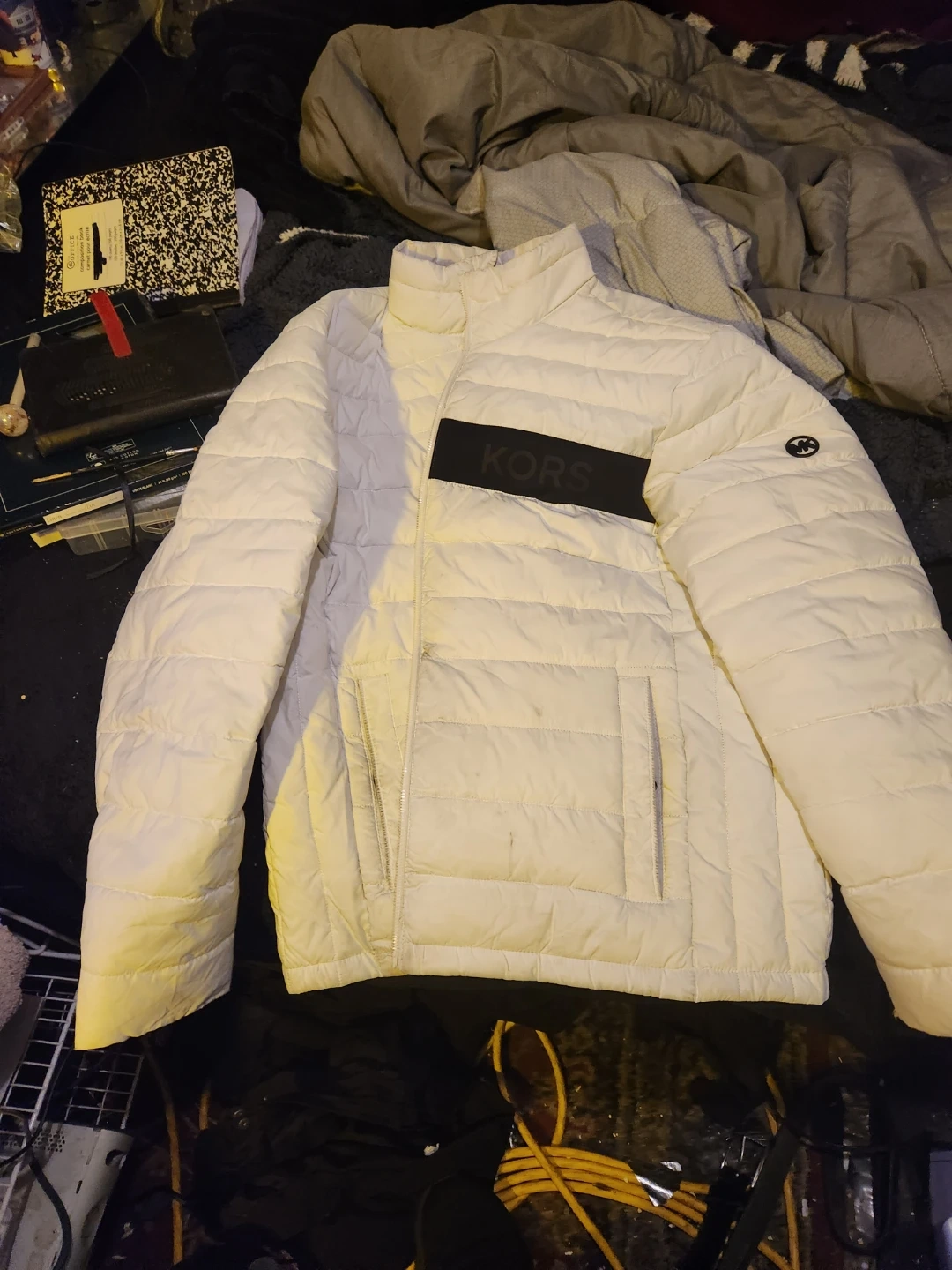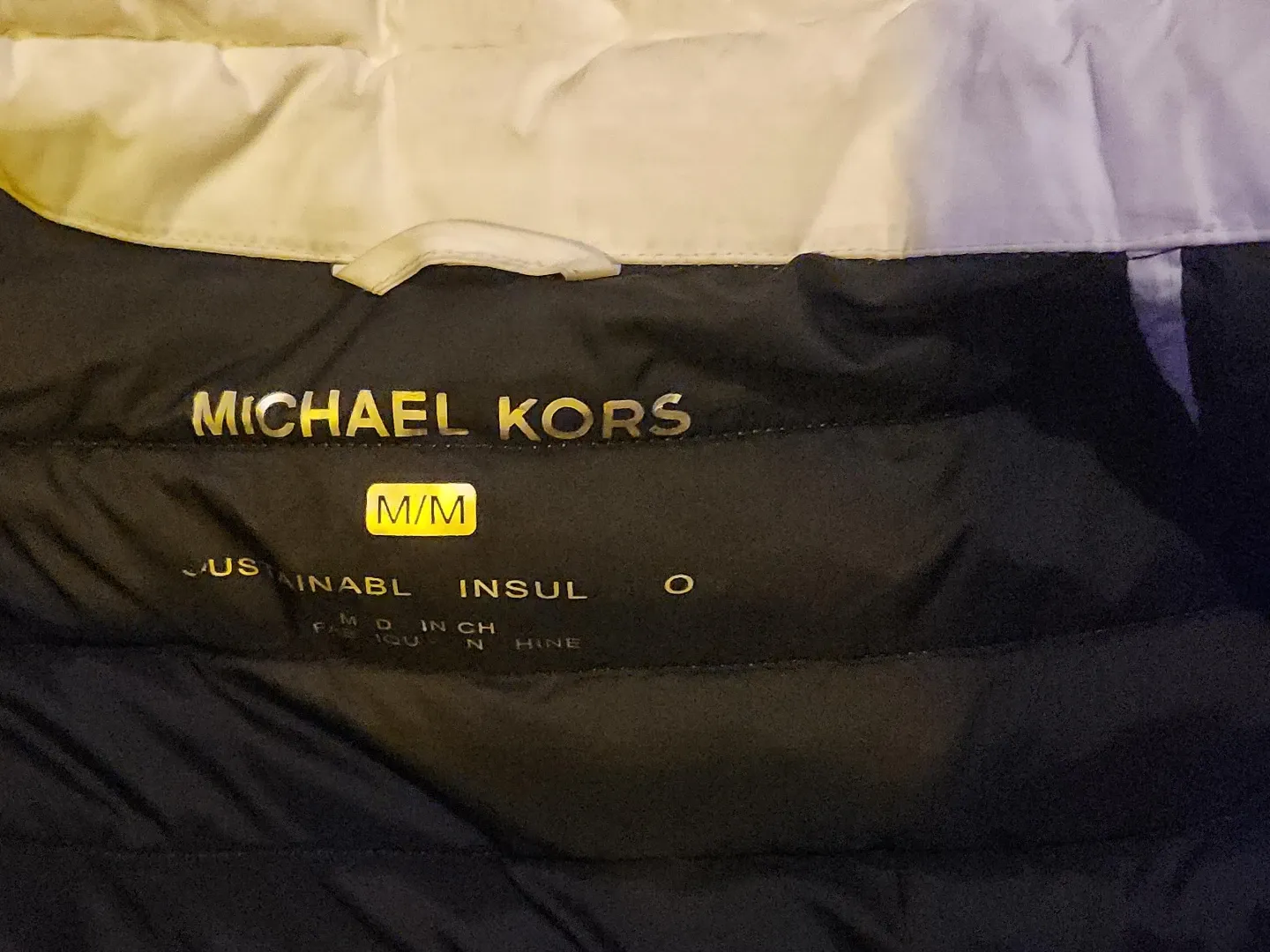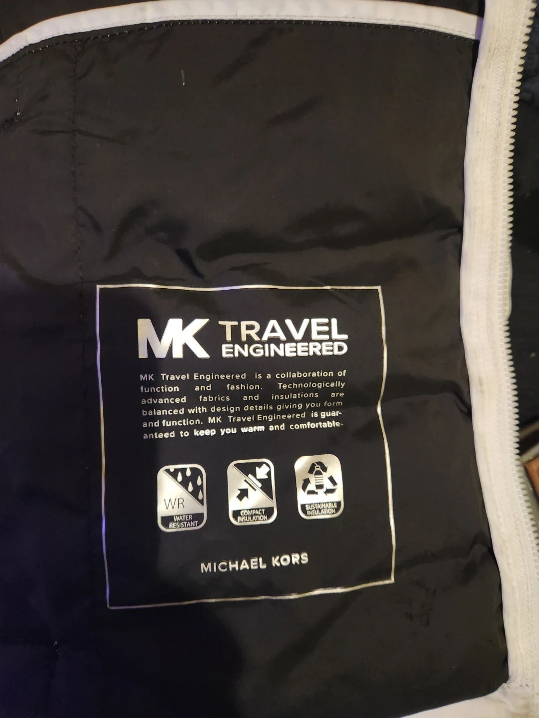 Selling a Michael Kors Travel Engineered puffer jacket in size M. It's white and features water-resistant and compact insulation to keep you warm and comfortable