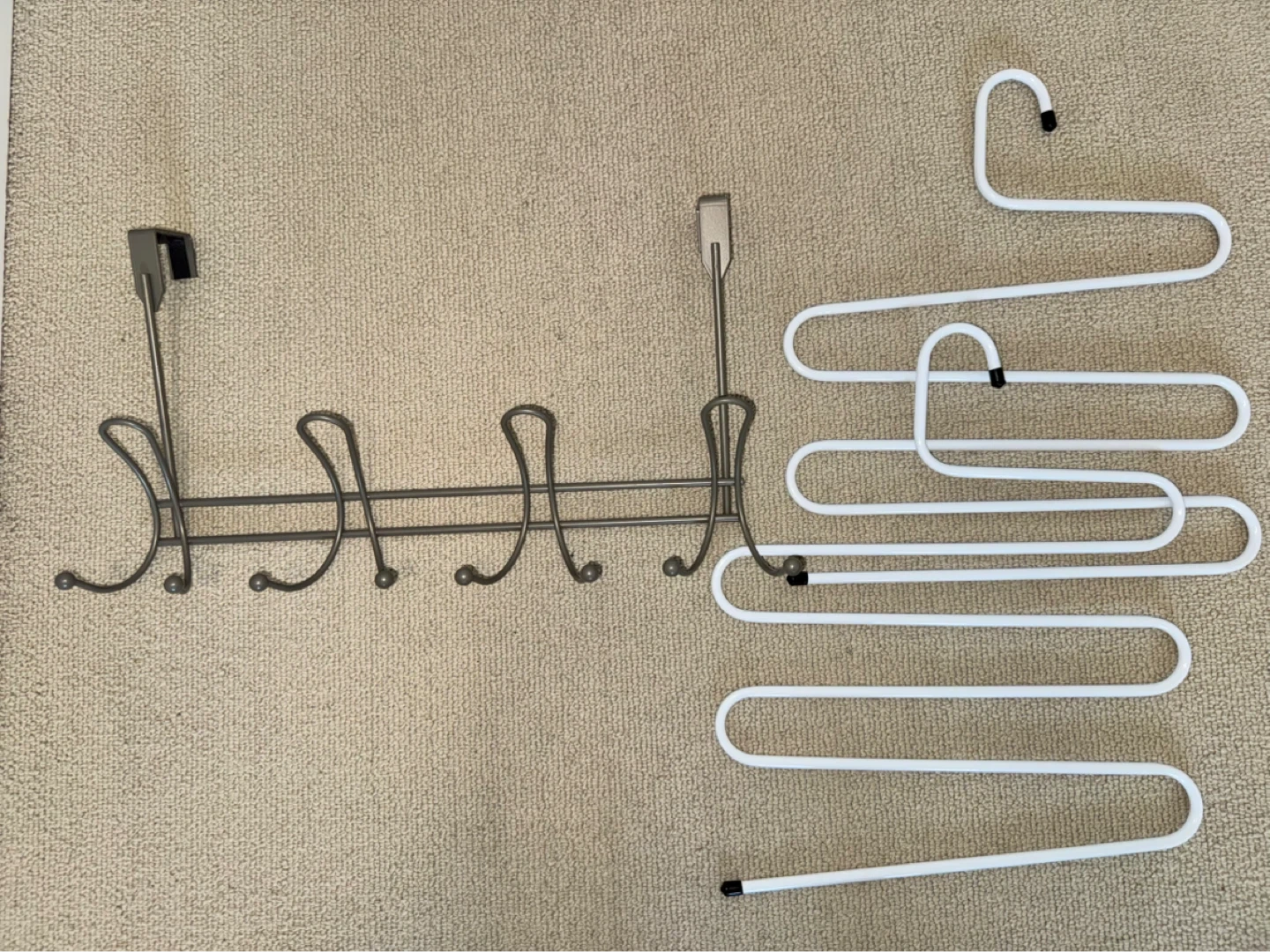 802Declutter your space with these handy organizers! I have an over-the-door hook rack, perfect for hanging coats, hats, or bags. Two multi-layer pants hangers to keep your wardrobe tidy and wrinkle-free. Take all for $10 cash.