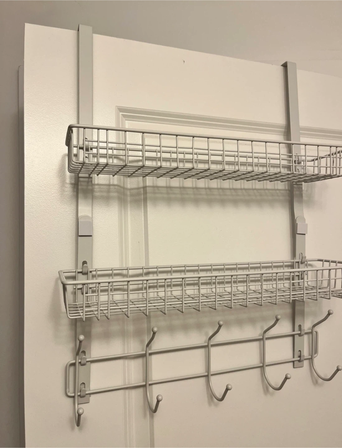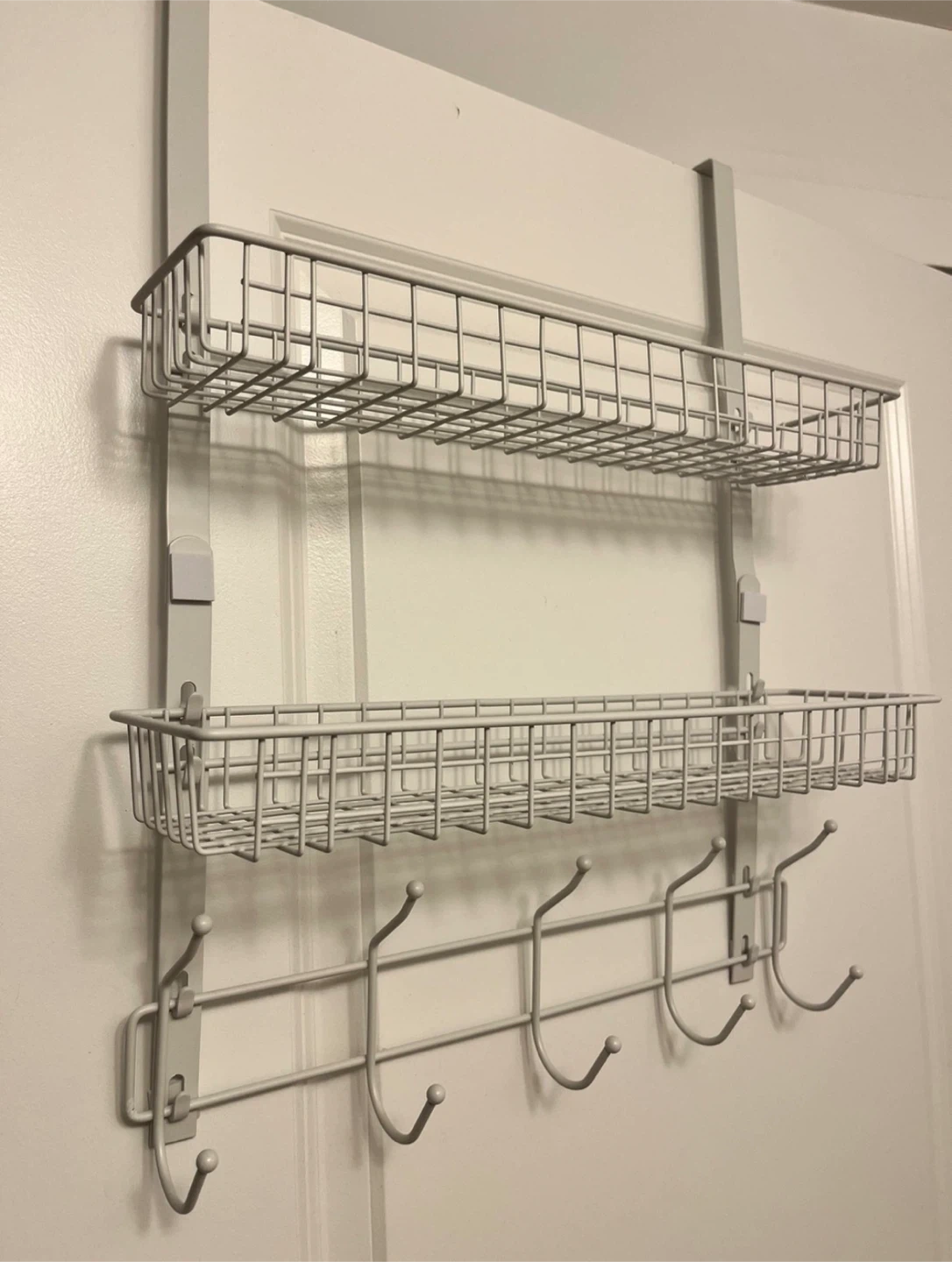 Declutter your space with this handy over-the-door organizer! It features two wire baskets for storage and hooks for hanging items like coats or towels. Perfect for adding extra storage to any room without taking up floor space
