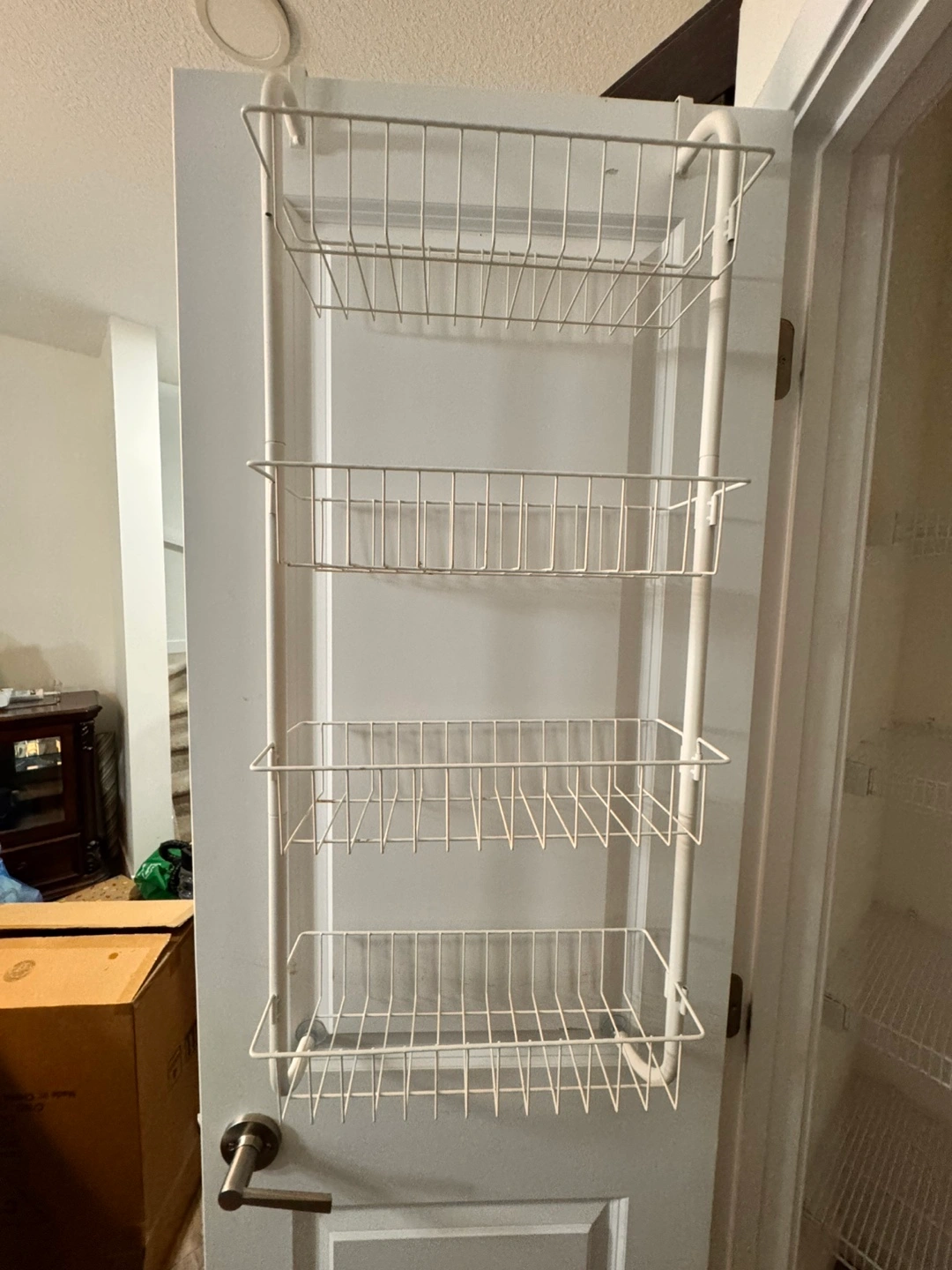 30Declutter your space with this handy over-the-door organizer! It's perfect for adding extra storage to your pantry, bathroom, or closet. The white metal design is simple and clean, fitting in with any decor. It's in great shape and ready to help you get organized