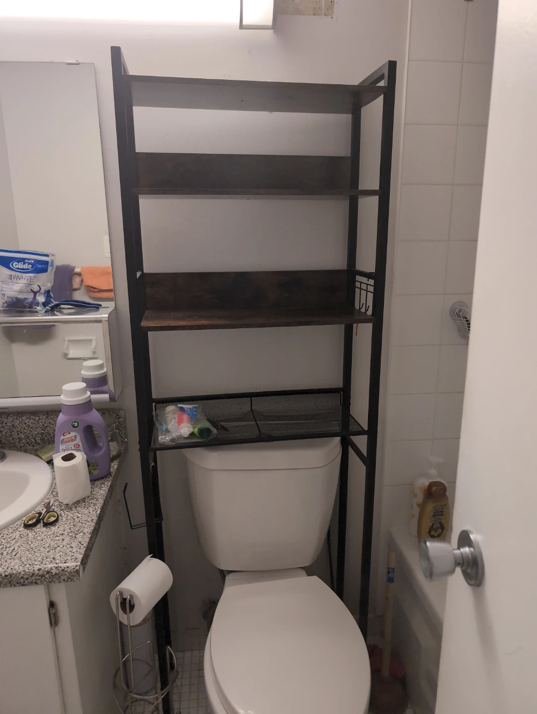 26Selling a handy over-the-toilet shelf unit! It's a great way to add some extra storage to your bathroom, especially if you're short on space. The shelf is in good condition and ready to use. Comes with toilet paper holder. Dimensions are 24" x 9.5" x 68". Unit is 3 years old, in great shape