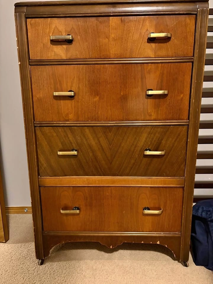 This is a beautiful antique dresser. It has a classic design and would be a great addition to any bedroom or living space. It has 4 drawers that offer ample storage. The wood is in good condition with some minor signs of age, consistent with its antique nature.