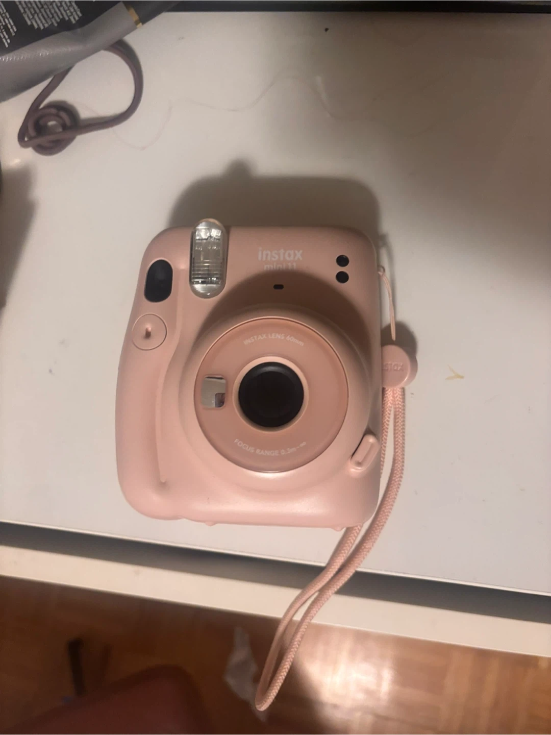 This is a Fujifilm Instax Mini 11 instant camera. It's a light pink colour. The focus range is 0.3m to infinity.