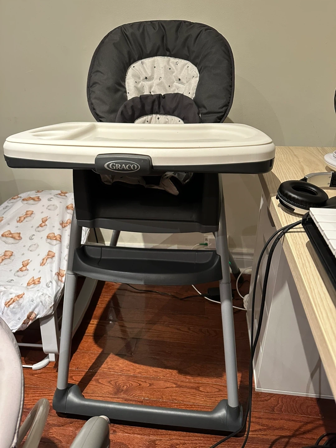 This is a Graco high chair with a removable tray. It has a padded seat and adjustable straps. Great for feeding time 240 original price