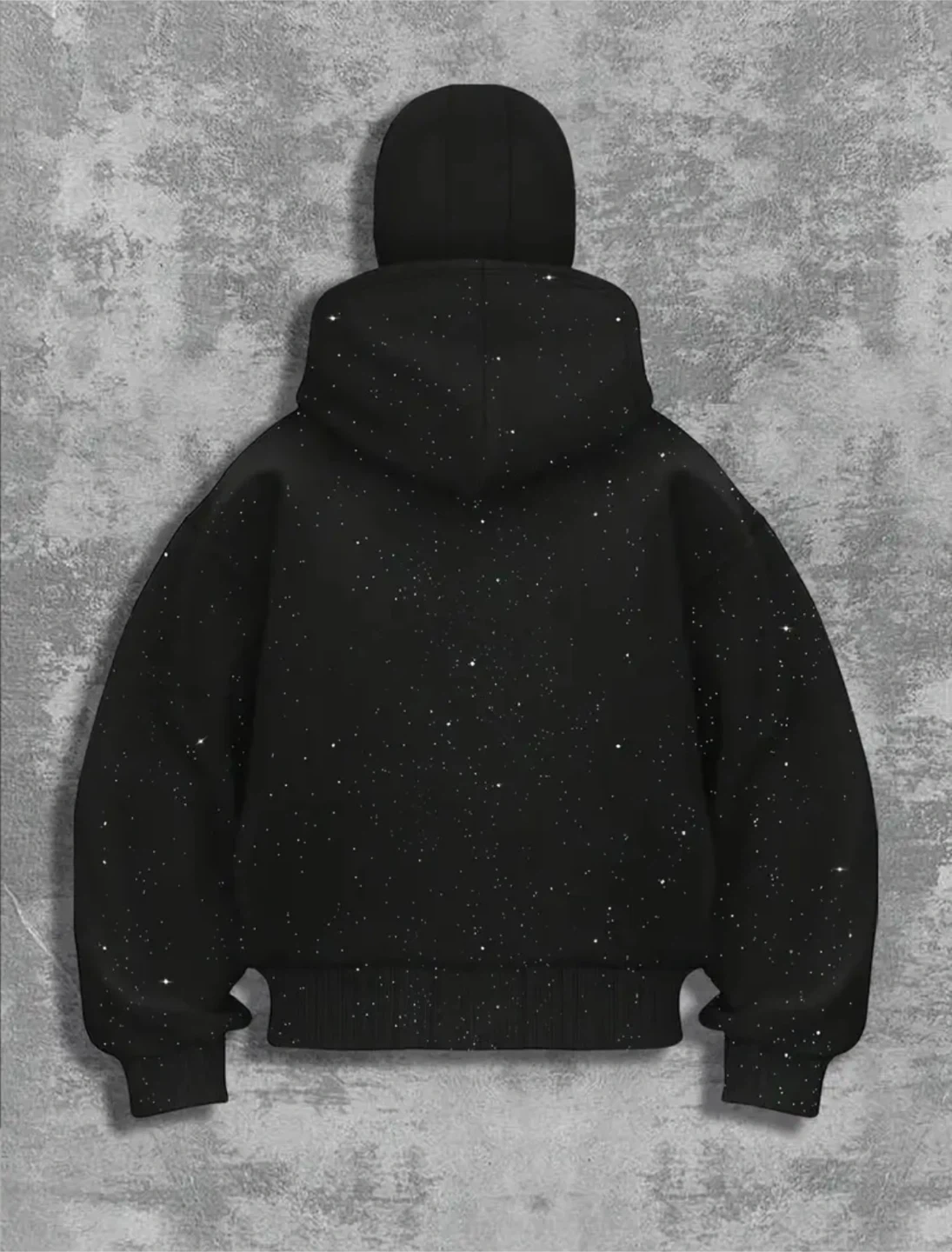 New, unworn black zip-up hoodie features a built-in balaclava for full face coverage. It's adorned with subtle glitter accents, giving it a unique starry night effect. Size M.