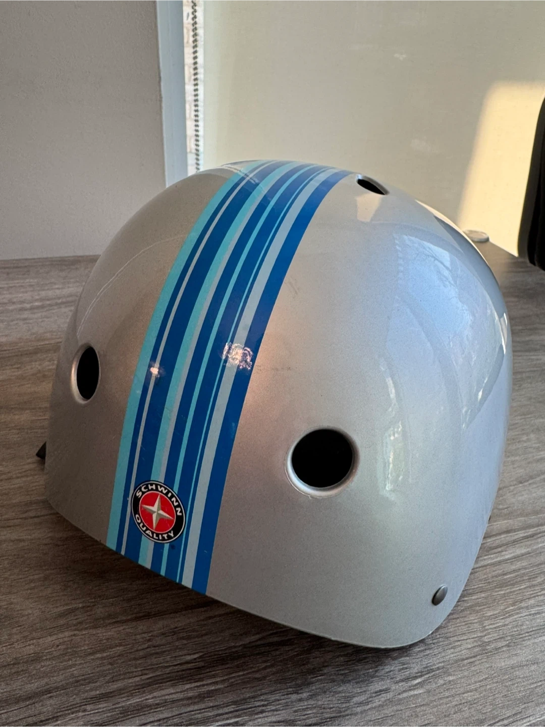 This is a Schwinn bike helmet in silver with blue stripes. It's designed for cycling and features vents for airflow. The adjustable straps ensure a snug fit for safety.