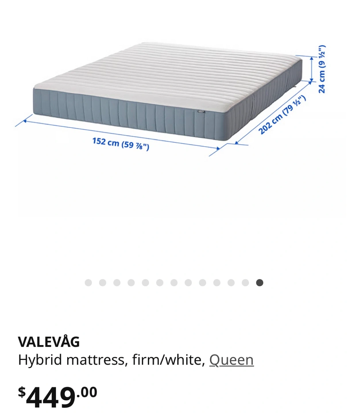 IKEA VALEVÅG hybrid mattress in Queen size. It's firm and white with standard foam for all-over support and comfort. Dimensions are 152 cm wide by 202 cm long and 24 cm thick. Offers consistent support throughout the mattress.