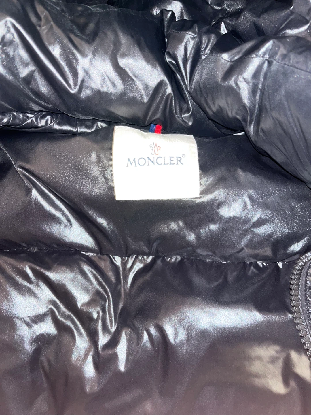 Black shiny puffer jacket from Moncler. It's a warm and stylish outerwear option. Made with high-quality materials for durability and comfort.