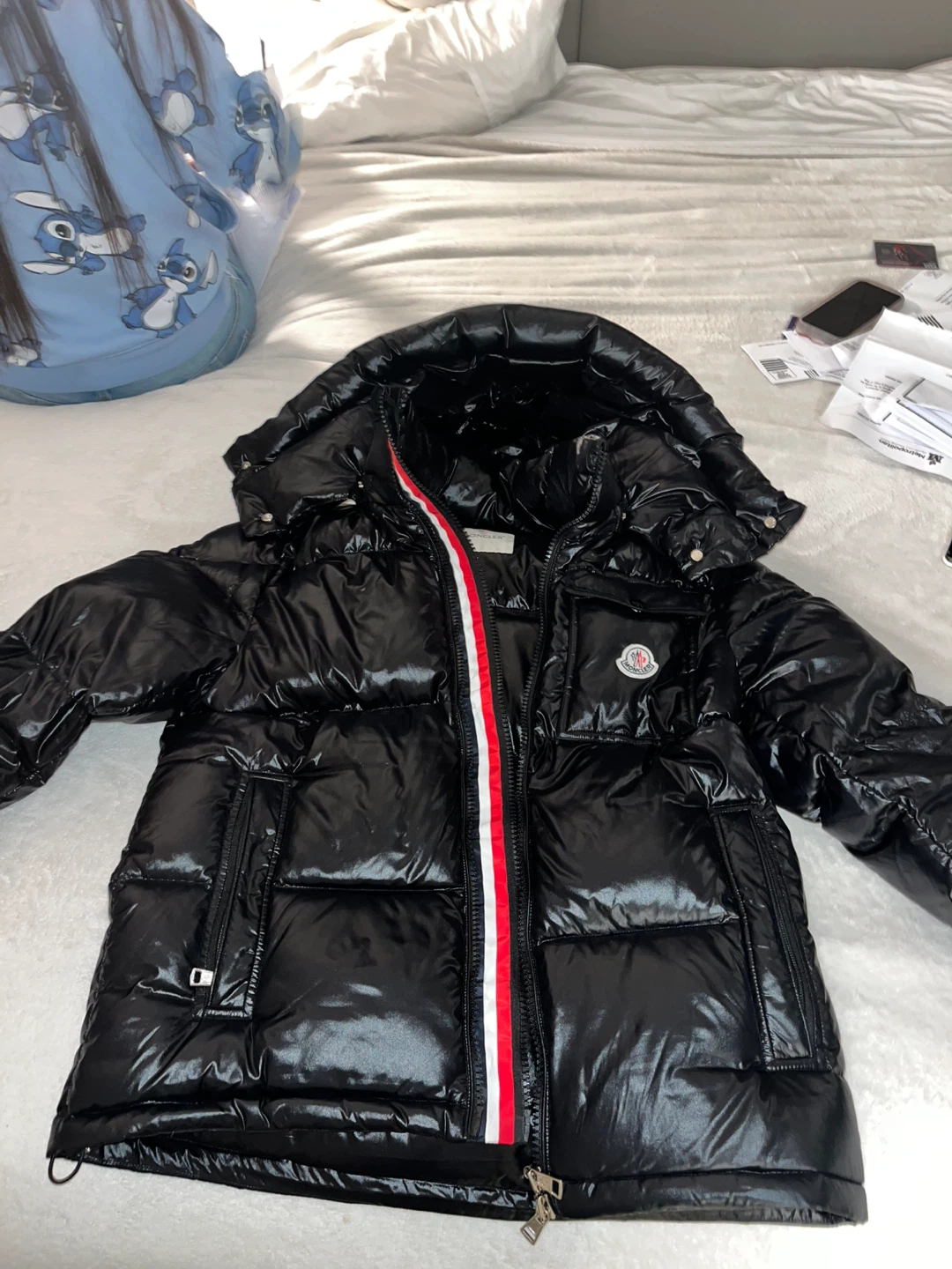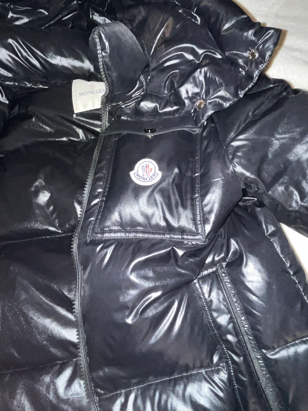 Black shiny puffer jacket from Moncler. It's a warm and stylish outerwear option. Made with high-quality materials for durability and comfort.