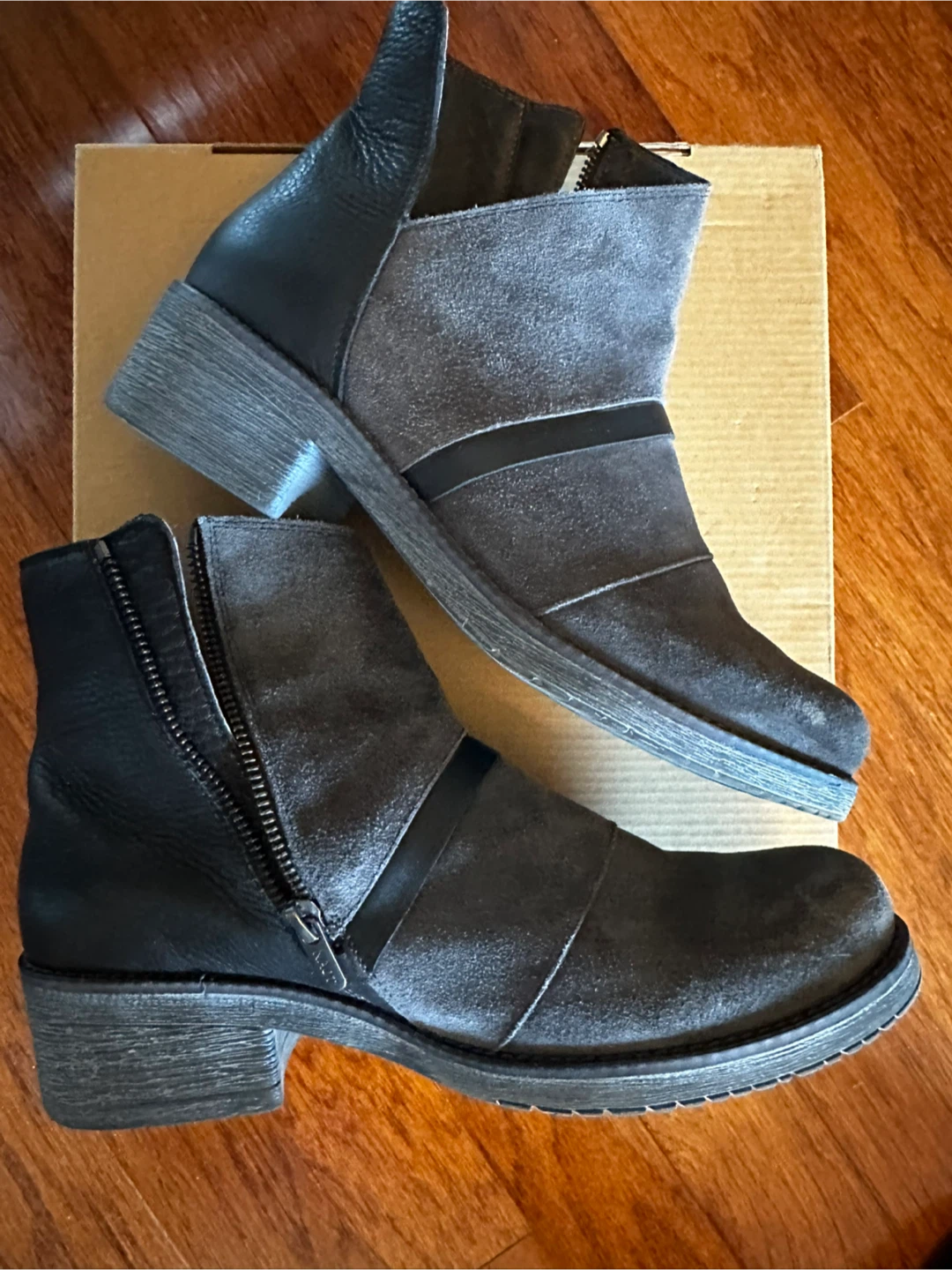 Grey suede and black leather ankle boots with side zippers. Naot Style “Emerald”. Barely worn, like new