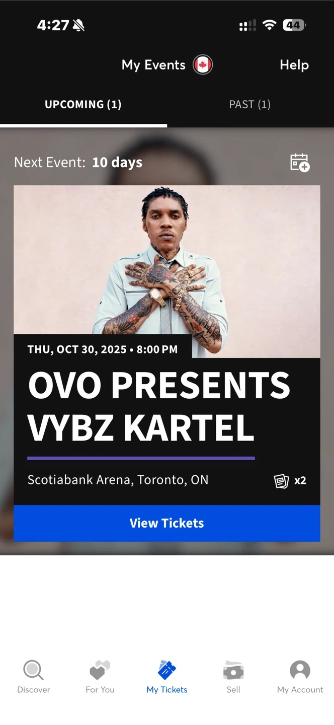 Selling two tickets to OVO Presents Vybz Kartel at Scotiabank Arena in Toronto on Thursday, October 30, 2025 at 8:00 PM 2 tickets as a pair for 1000 firm October 30th @8pm (last show) Section 118 Row 13 Seat (3) and (4) I will meet you in person and transfer to your name must have a Ticketmaster account Only selling cause of change of plans
