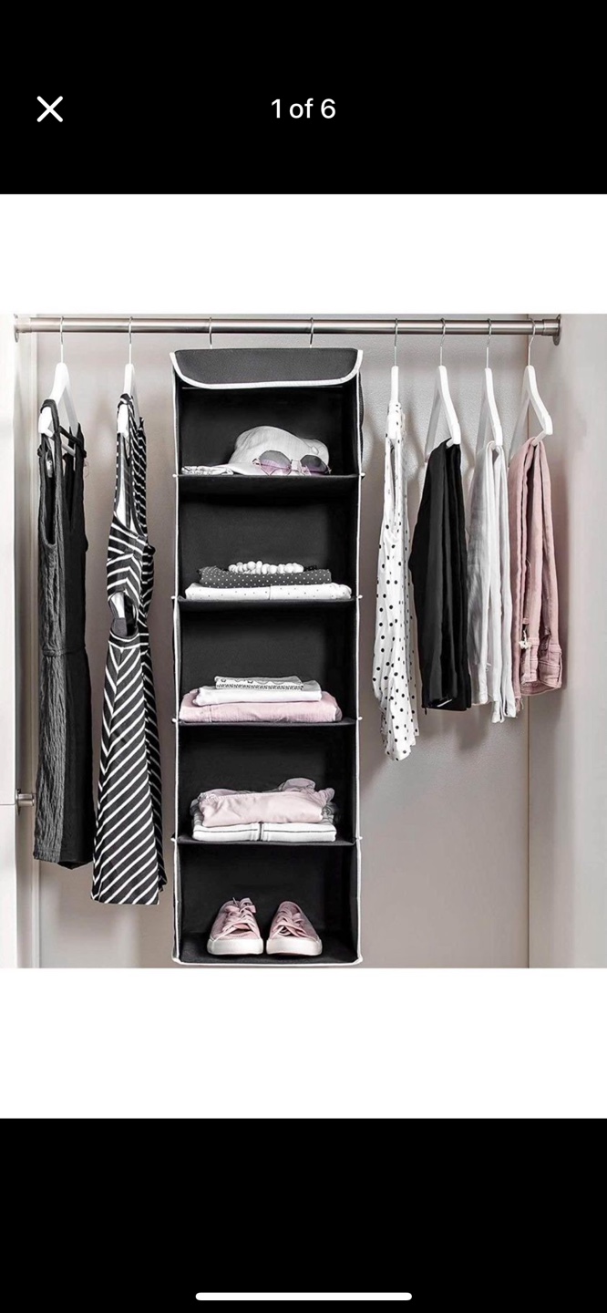 Black 5-shelf closet organizer with 6 mesh pockets. Frees floor and closet space with a slim design. Suitable for storing clothes, accessories, and other items.