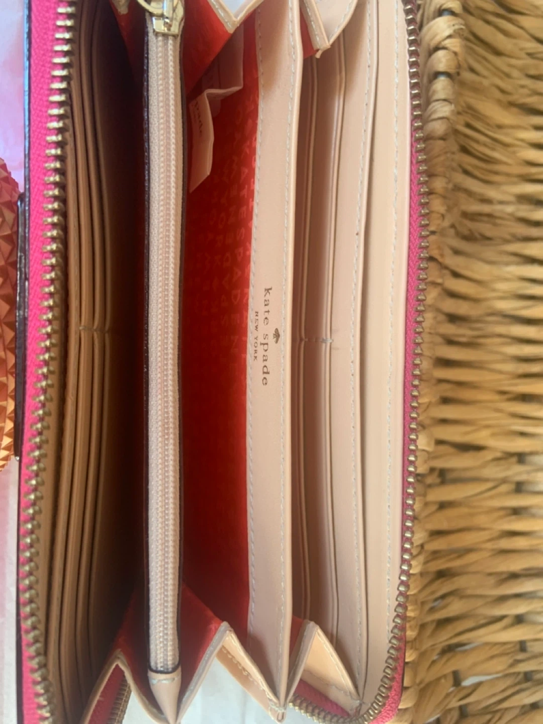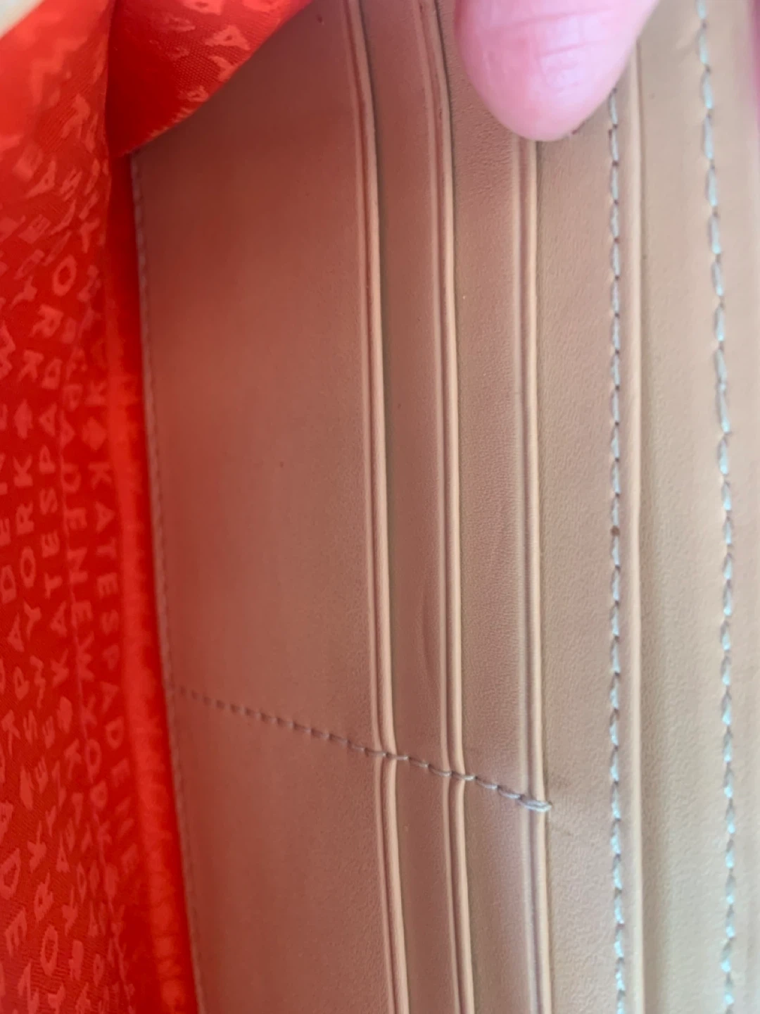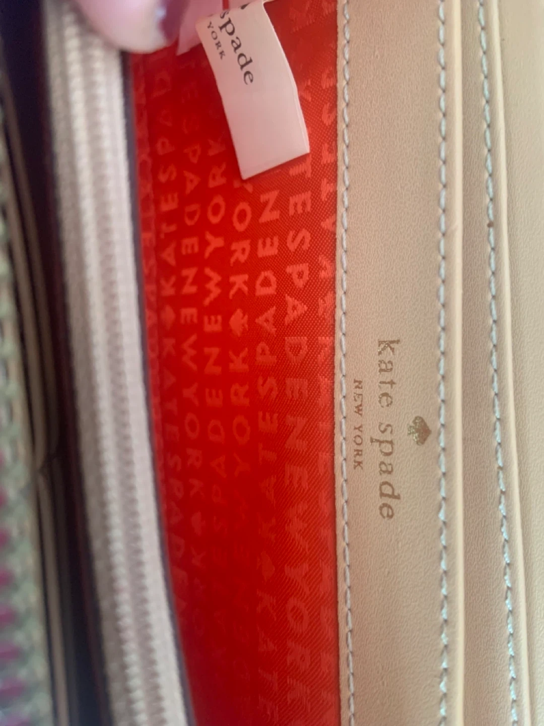 • Has boundless compartments in taupy cream and orange with Kate Spade pattern
