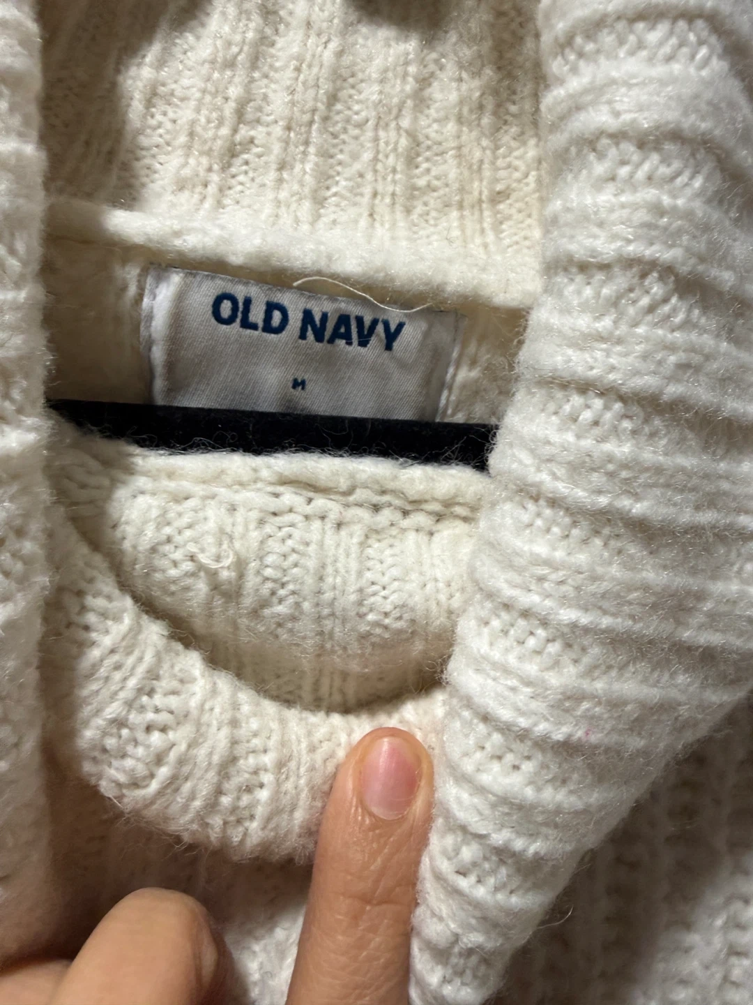 Cozy up in this Old Navy cream-colored turtleneck sweater! It's a size medium and perfect for staying warm and stylish during cooler weather. The material is soft and comfortable, making it a great addition to your wardrobe. Don't miss out!