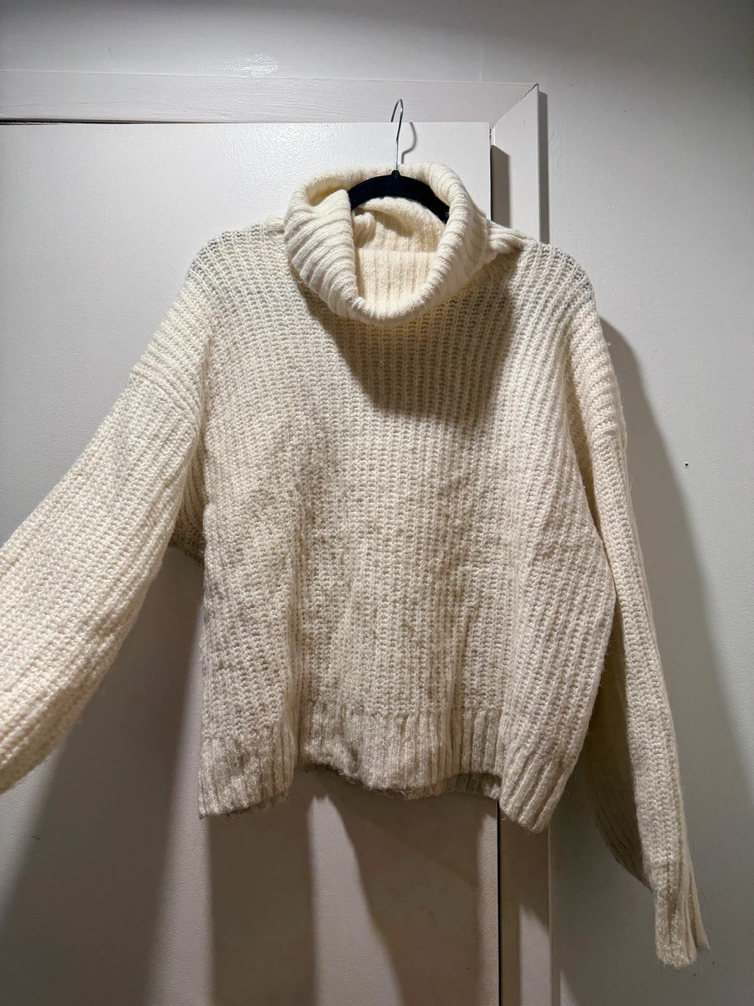 Cozy up in this Old Navy cream-colored turtleneck sweater! It's a size medium and perfect for staying warm and stylish during cooler weather. The material is soft and comfortable, making it a great addition to your wardrobe. Don't miss out!