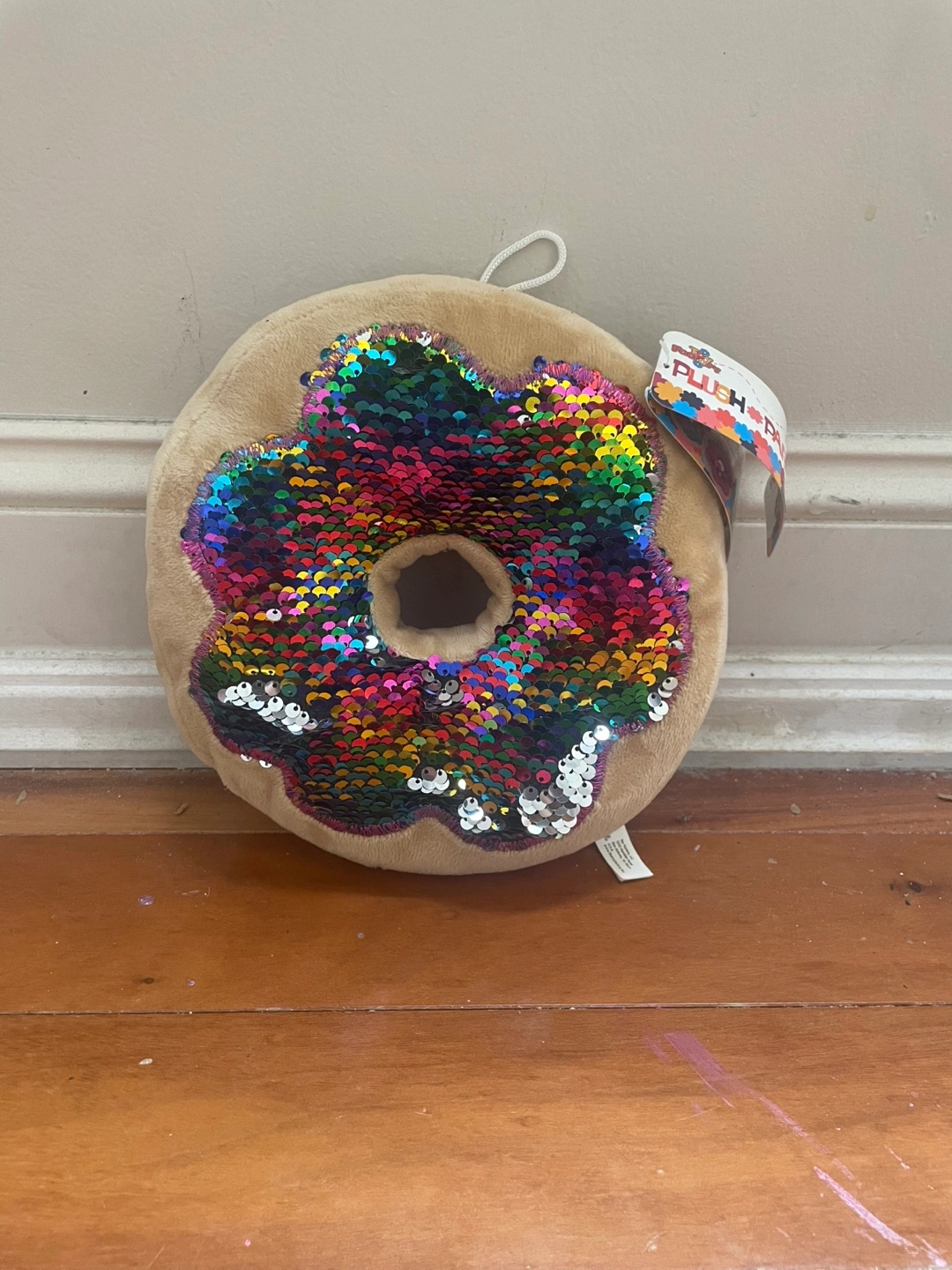 This plush donut is great for children and adults! It’s features rainbow sequin icing that can be flipped and become silver!