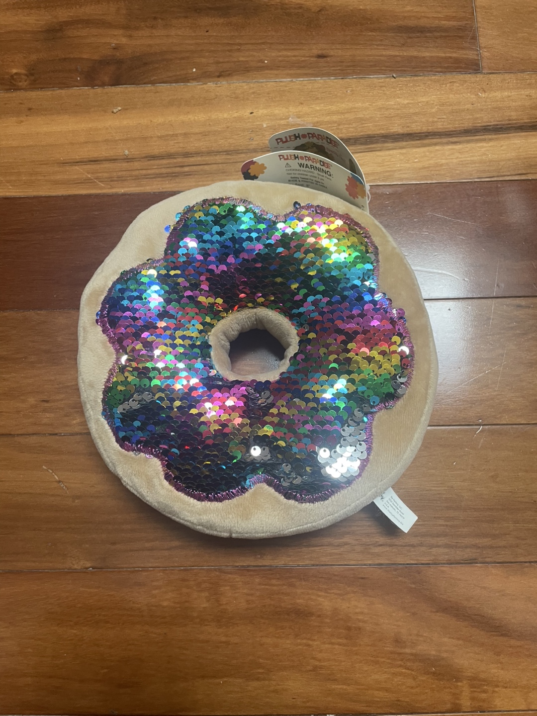 This plush donut is great for children and adults! It’s features rainbow sequin icing that can be flipped and become silver!