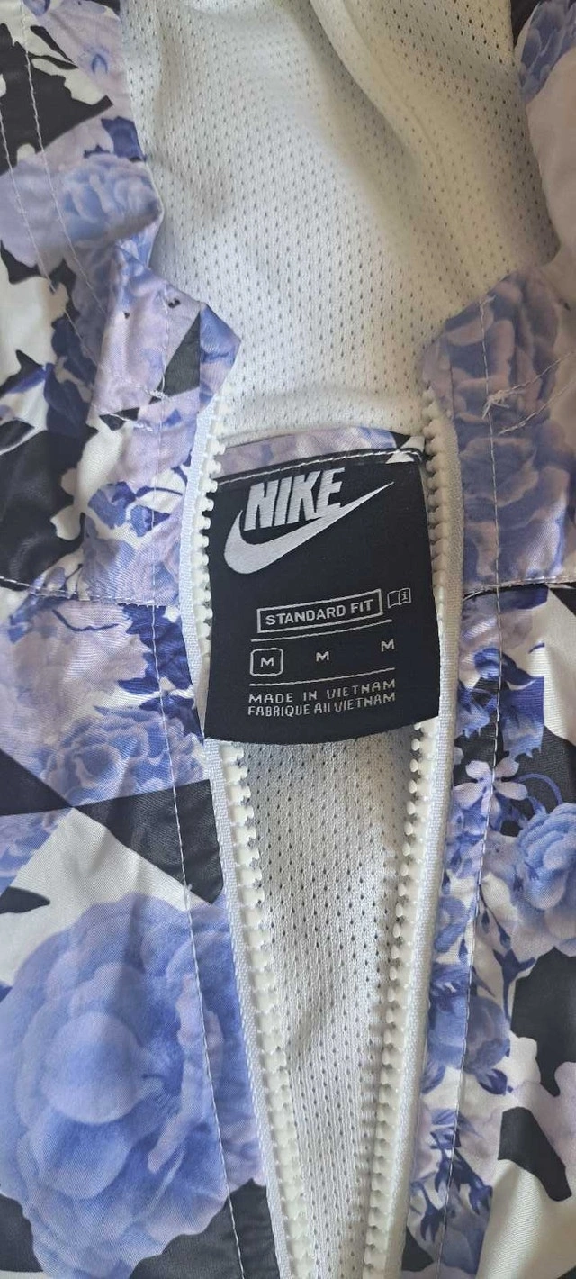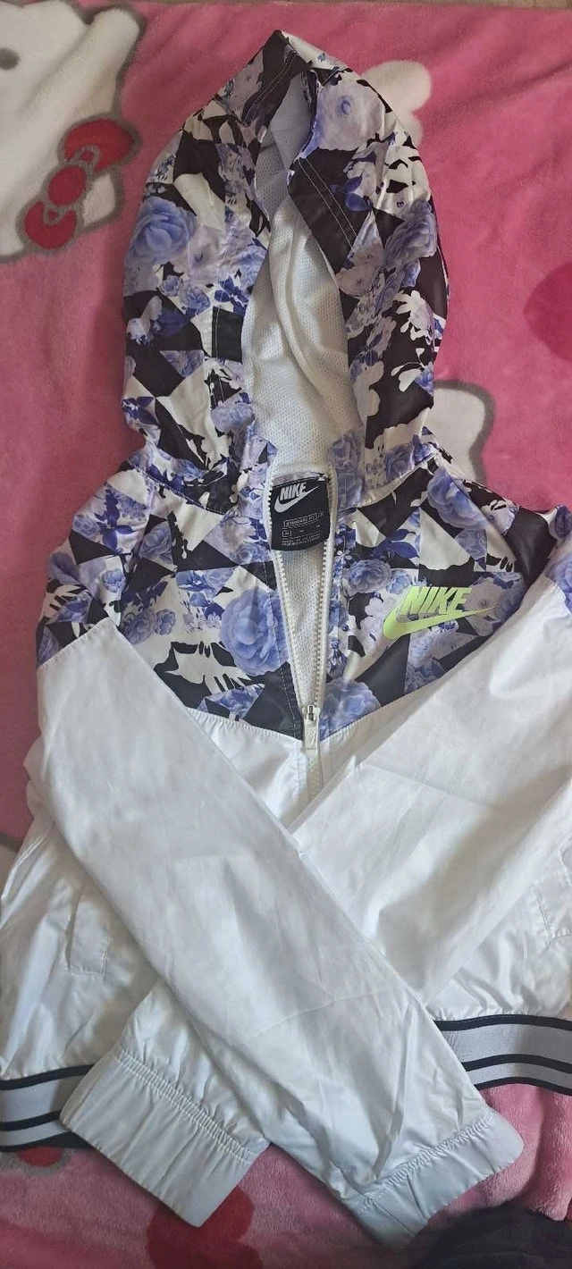 Used Nike girls jacket, great for light weather protection and in good condition. Features a stylish white color with a floral patterned hood and upper section. Size M. Cash accepted.