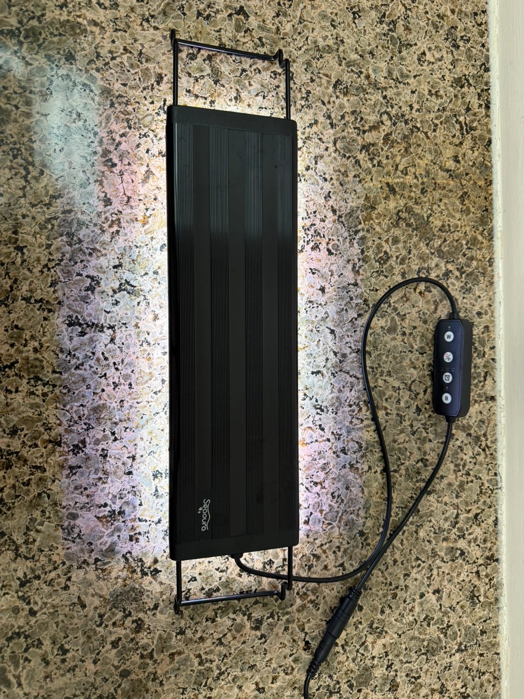 This SEAOURA LED aquarium light is designed for plants and fish tanks. It's 10W and fits 12-18 inch tanks. The light offers adjustable brightness and features white, blue, red, green, and pink LEDs with extendable brackets. It has a timer for auto on/off functionality.