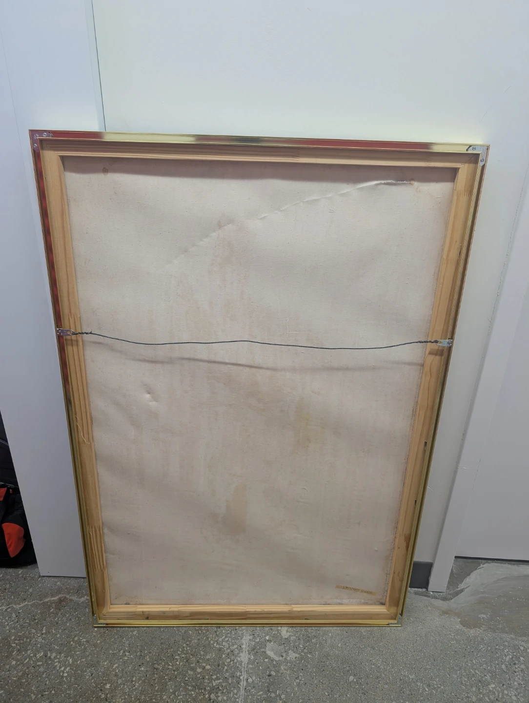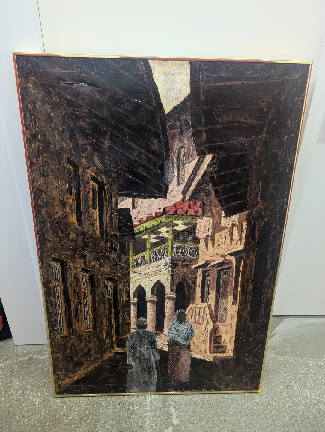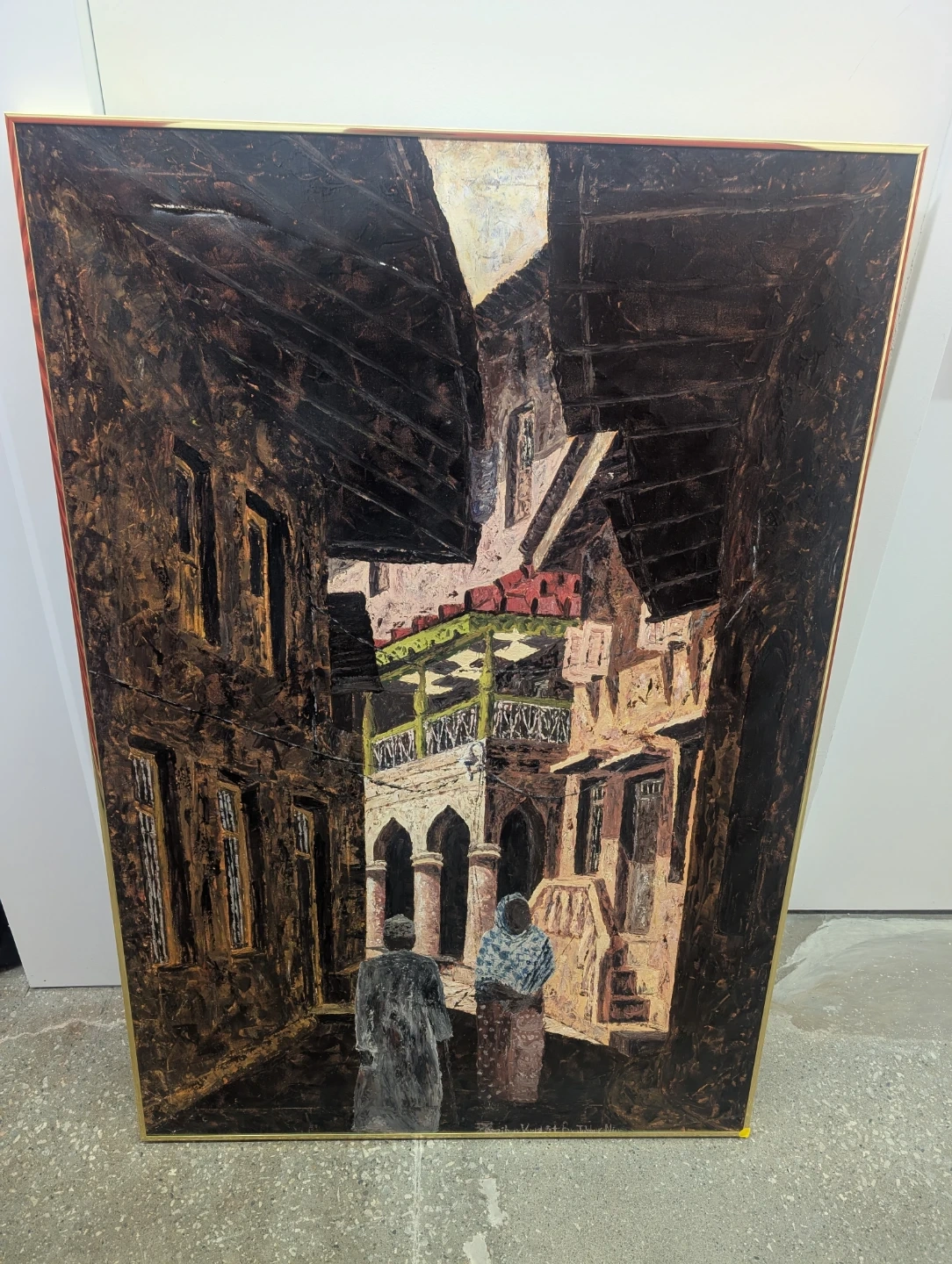 A textured original painting depicting a street scene with two figures. It's framed in a gold-coloured metal. The canvas shows signs of age and some staining on the backing.