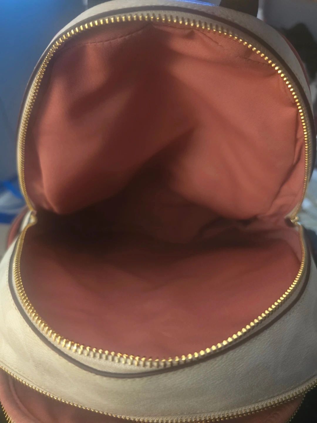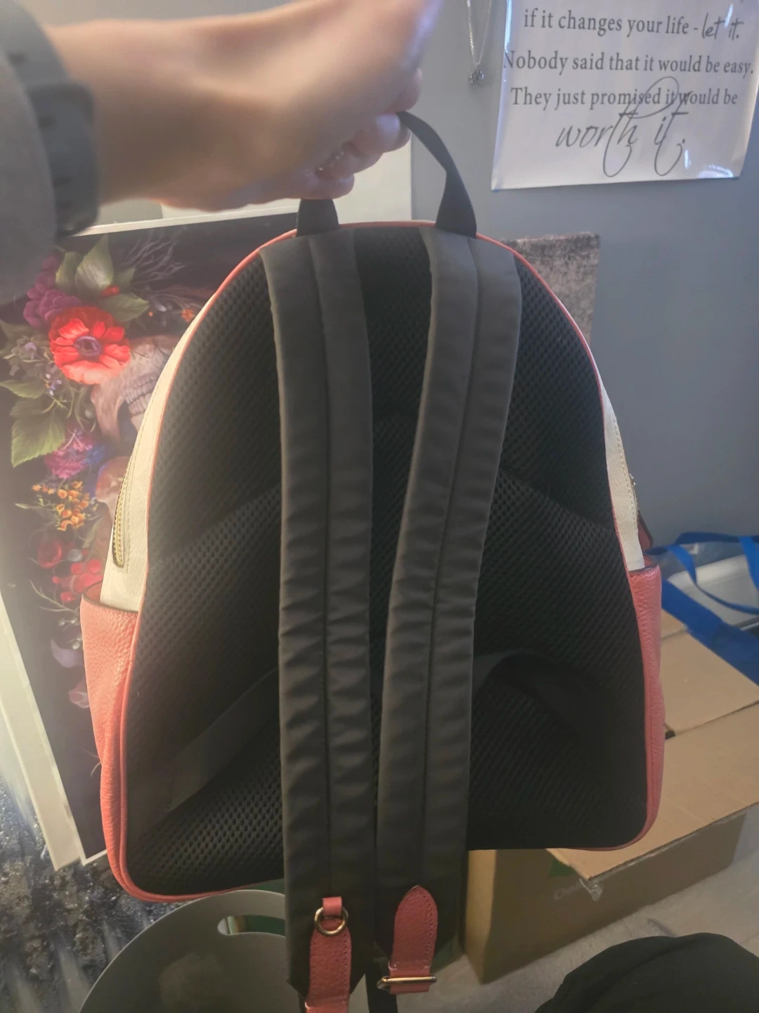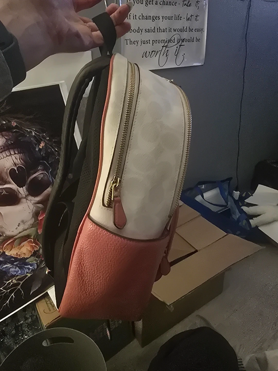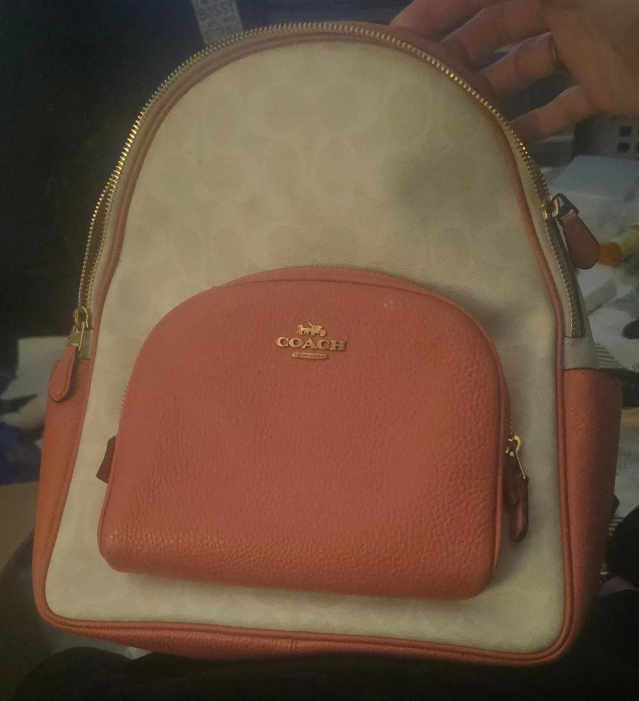 This is a Coach backpack featuring a signature pattern on the main body and a textured coral-coloured front pouch. It has gold-toned zippers. The backpack's straps are padded for comfort.