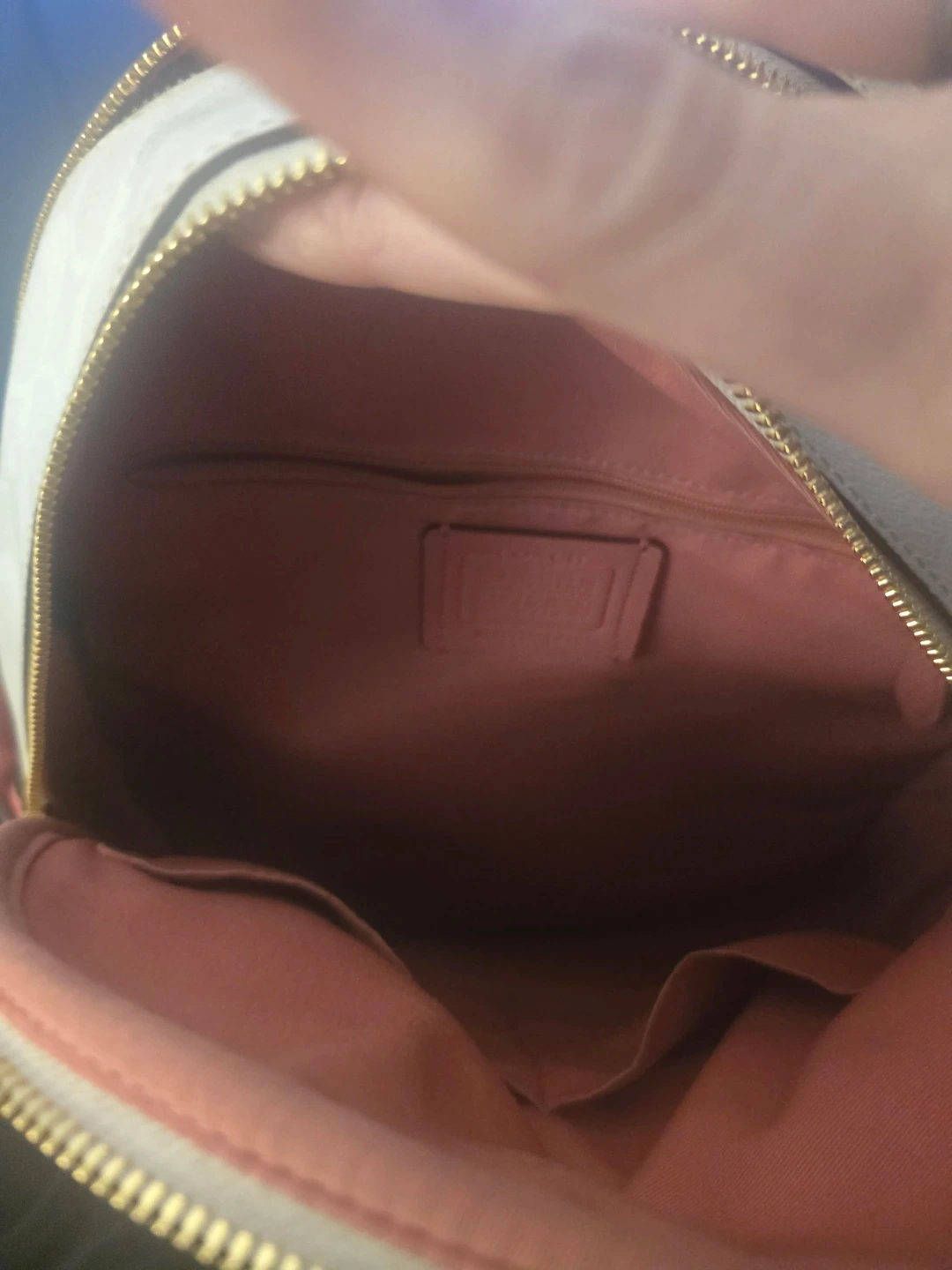 This is a Coach backpack featuring a signature pattern on the main body and a textured coral-coloured front pouch. It has gold-toned zippers. The backpack's straps are padded for comfort.