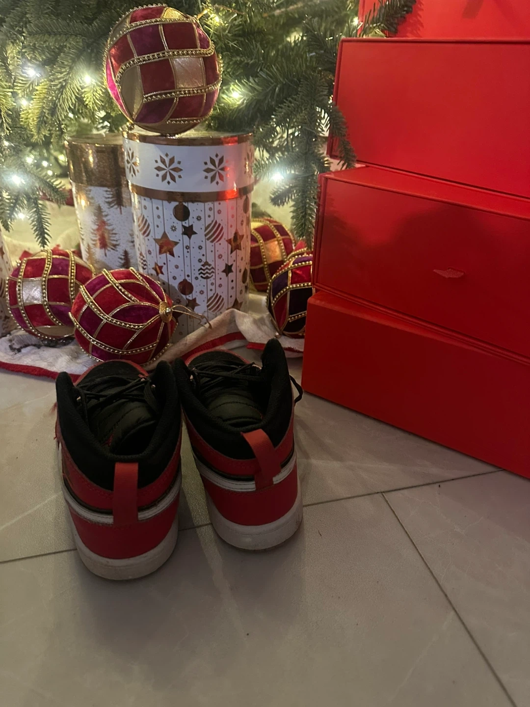 Selling a pair of Jordan Air 1 Mid sneakers for toddlers. They're in good condition and are a size 3Y in US sizing. The colour is black and red.