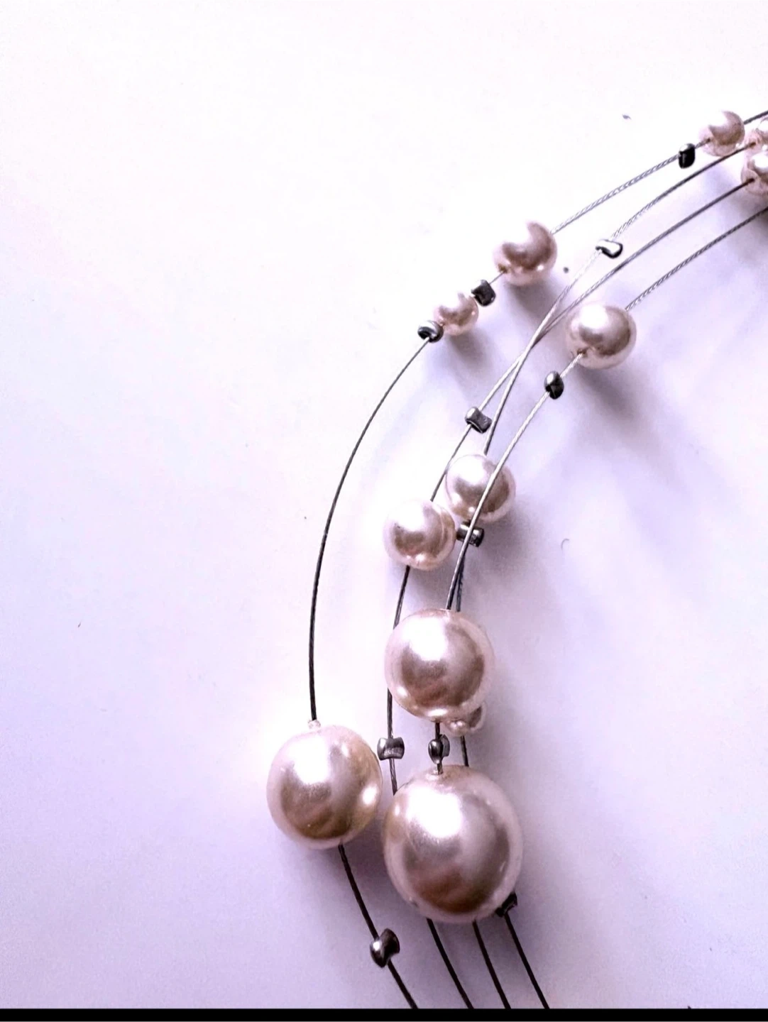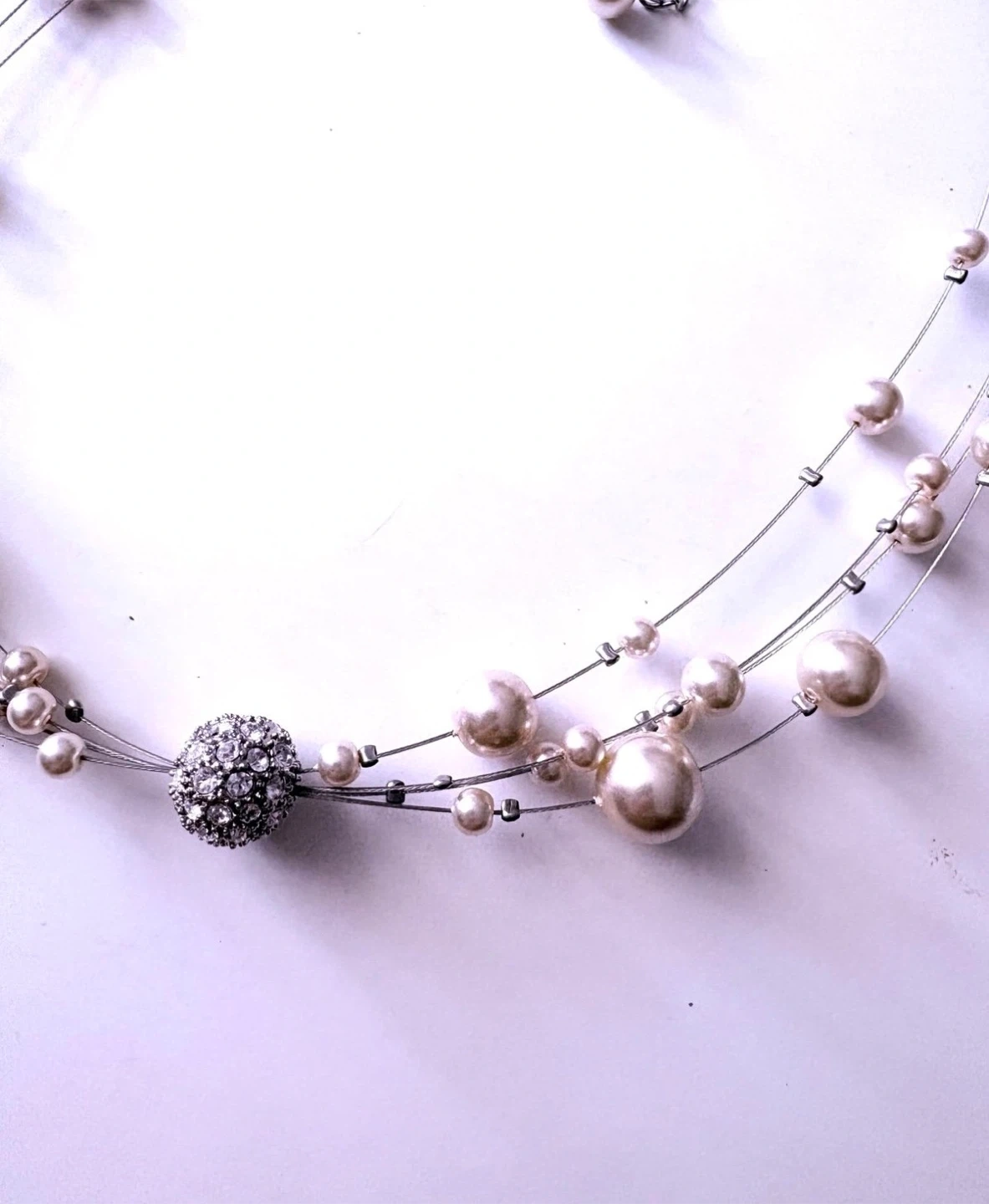 A pretty multi-strand necklace featuring faux pearls in varying sizes and a central sparkly rhinestone accent. The chain is silver-tone and includes an adjustable extender. It's a versatile accessory that adds a touch of glamour!
