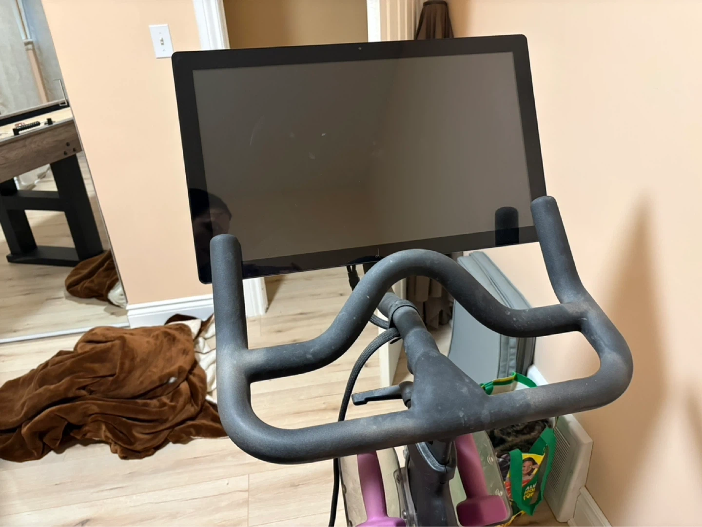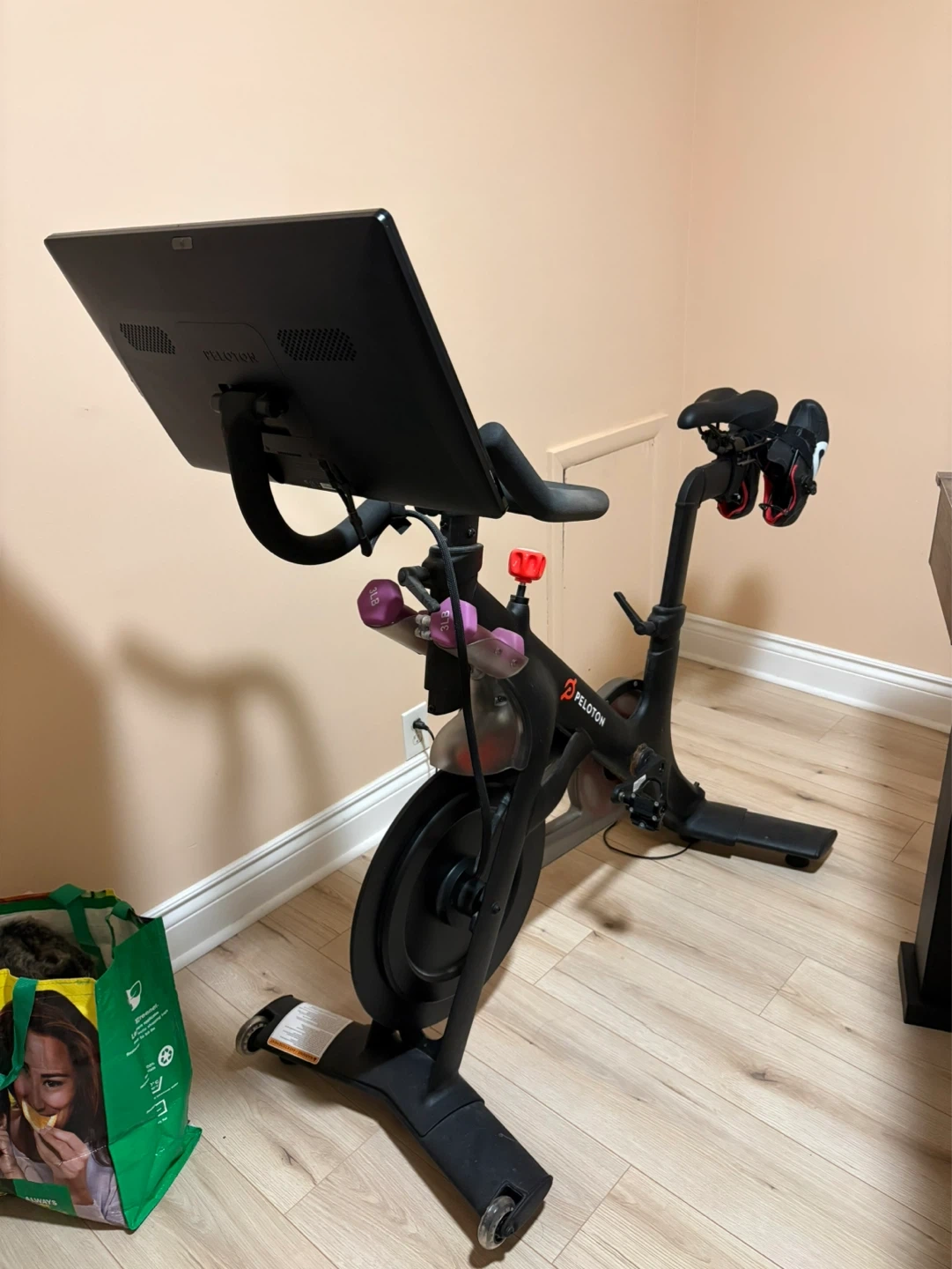 This Peloton Bike+ is a great way to get a workout in at home! It has a large touchscreen display. Includes shoes and weights.