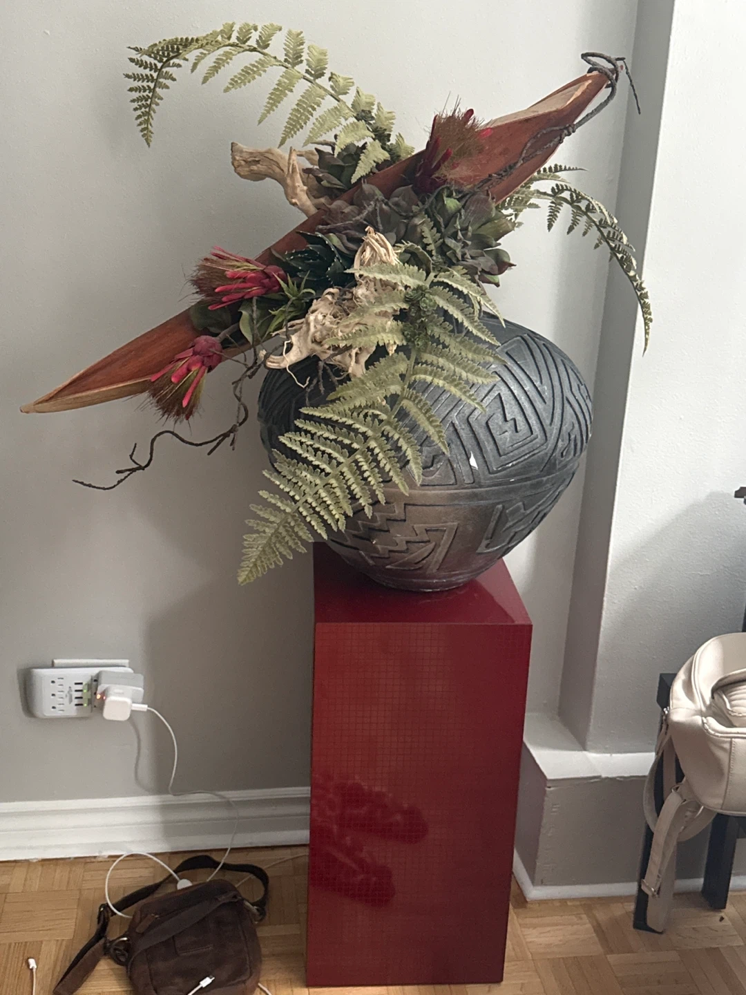 Unique, dark grey ceramic vase with an etched geometric design. Features a dramatic arrangement of faux ferns, wood accents, and red floral elements. This piece is a striking statement for any room.