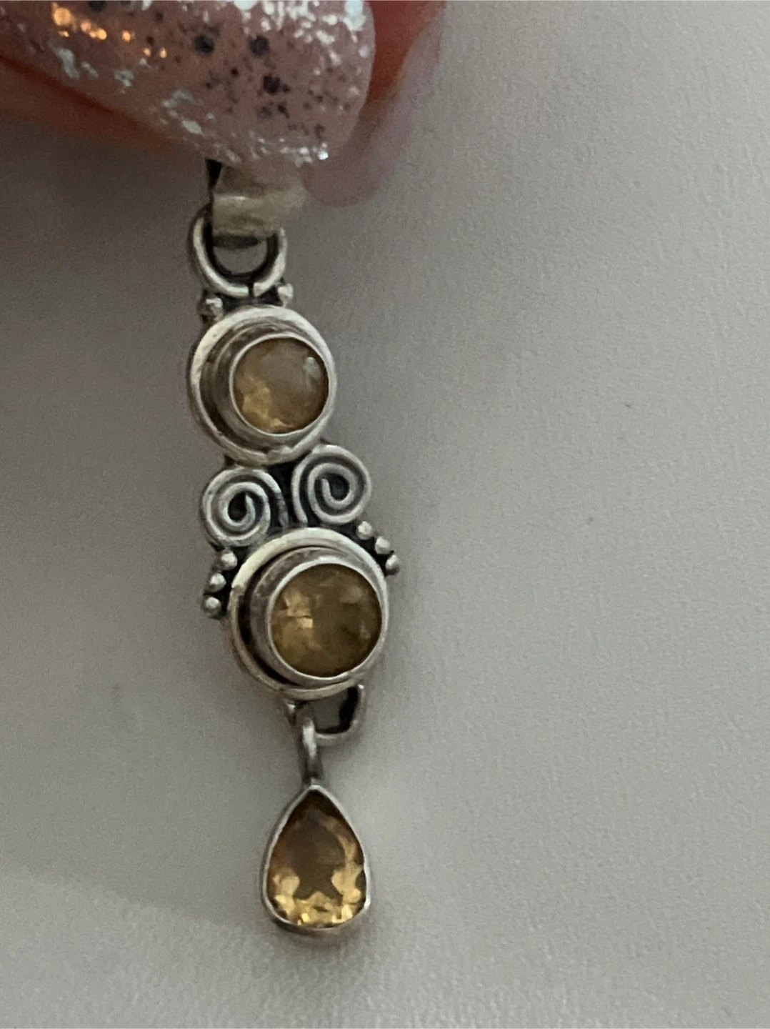 Selling a lovely sterling silver pendant featuring citrine stones. It's marked with '925' indicating sterling silver. The pendant is approximately 2 inches in length. It's in great condition and ready to add some sparkle to your outfit!