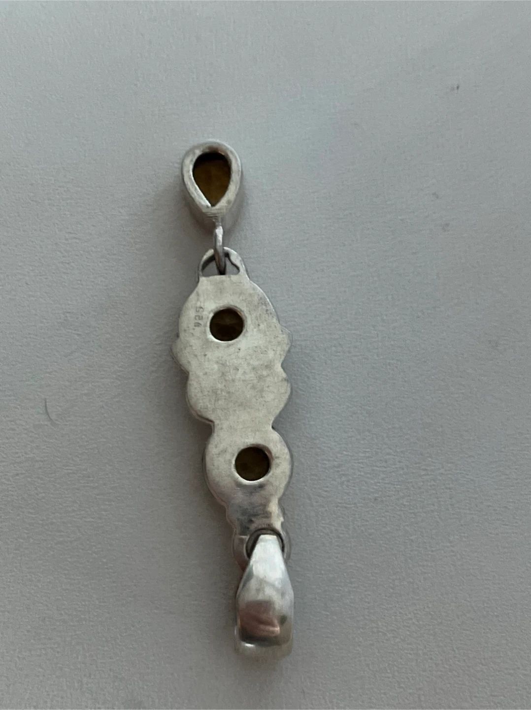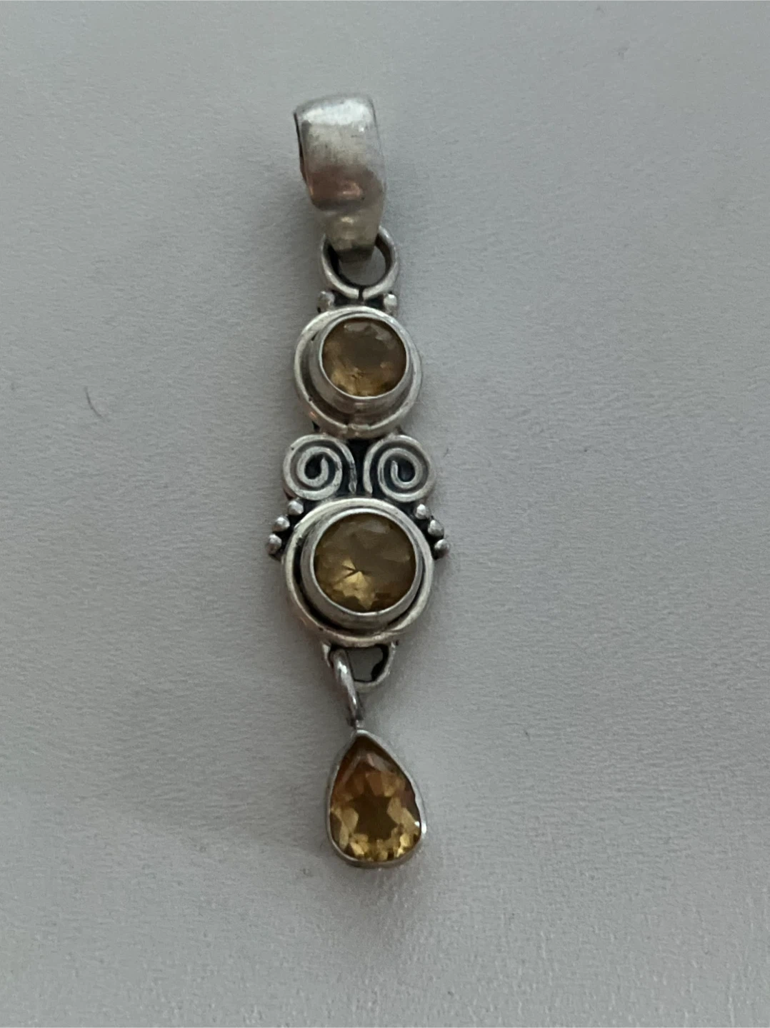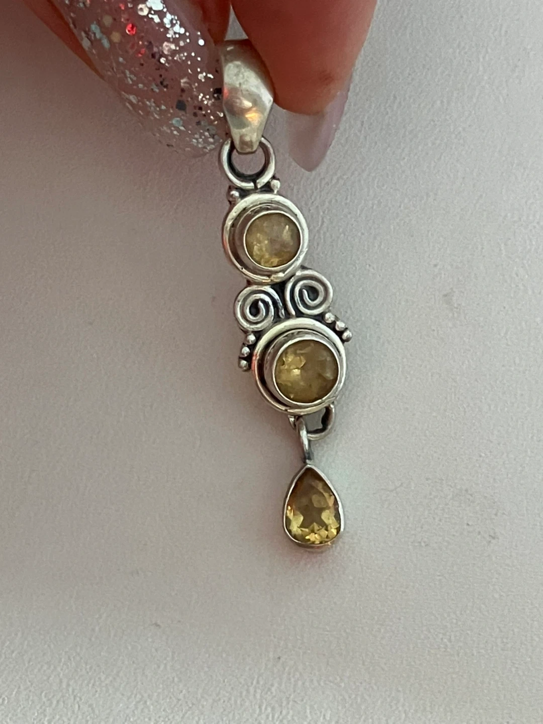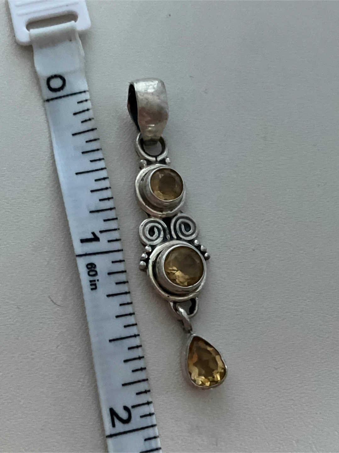Selling a lovely sterling silver pendant featuring citrine stones. It's marked with '925' indicating sterling silver. The pendant is approximately 2 inches in length. It's in great condition and ready to add some sparkle to your outfit!