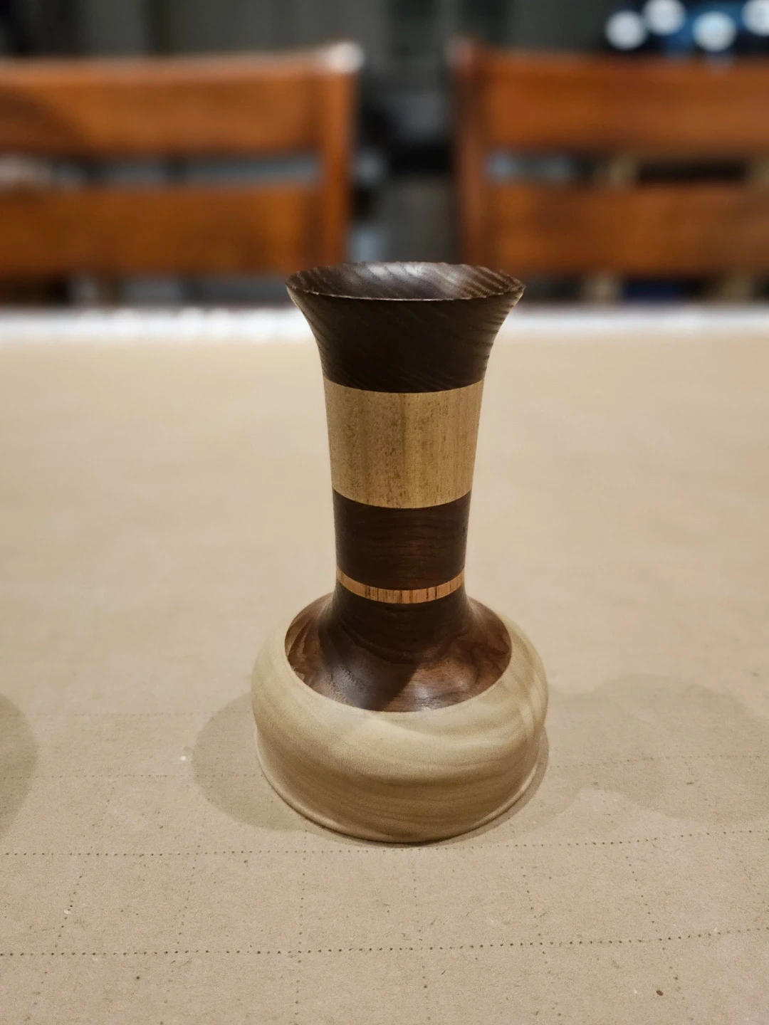 This is a handmade wooden vase, crafted from contrasting wood types for a unique look. It features a layered design with distinct bands of colour. Its compact size makes it suitable for displaying small dried flowers or as a decorative accent piece.