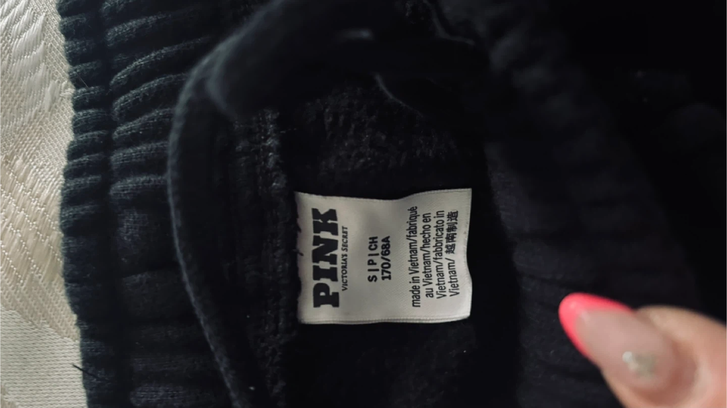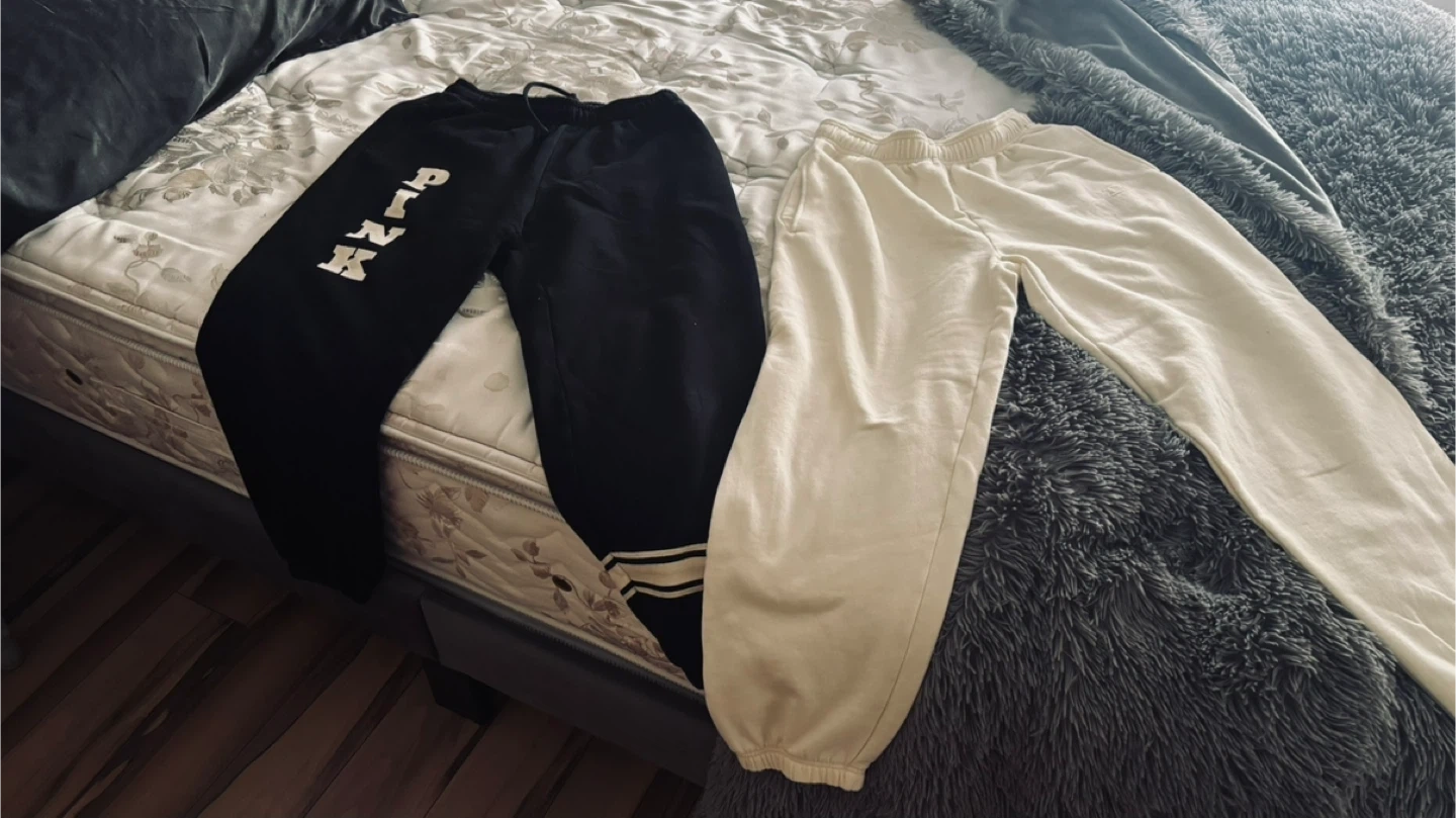 Two pairs of Pink VS pink sweatpants. One pair is black and the other is cream. Both are size small. Made from a comfortable cotton blend.