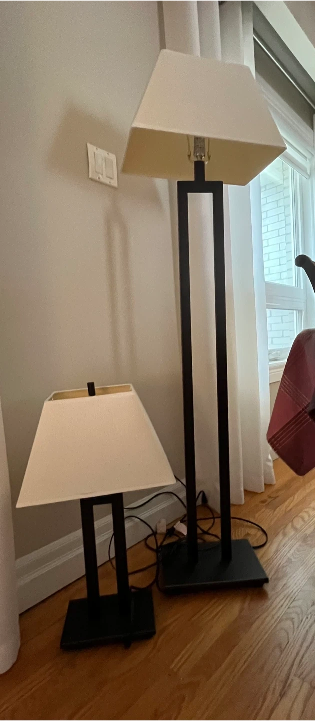 Used in excellent condition. Dark brown base with off-white rectangular shades. Shades give off warm glow. $40 for the set. Table lamp is 25” tall. Floor lamp is 60” tall.