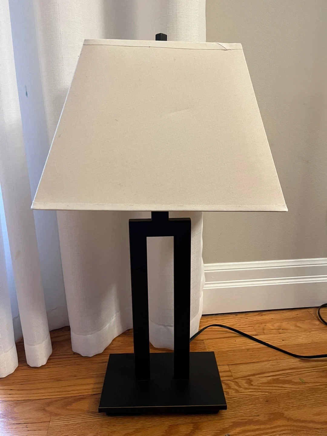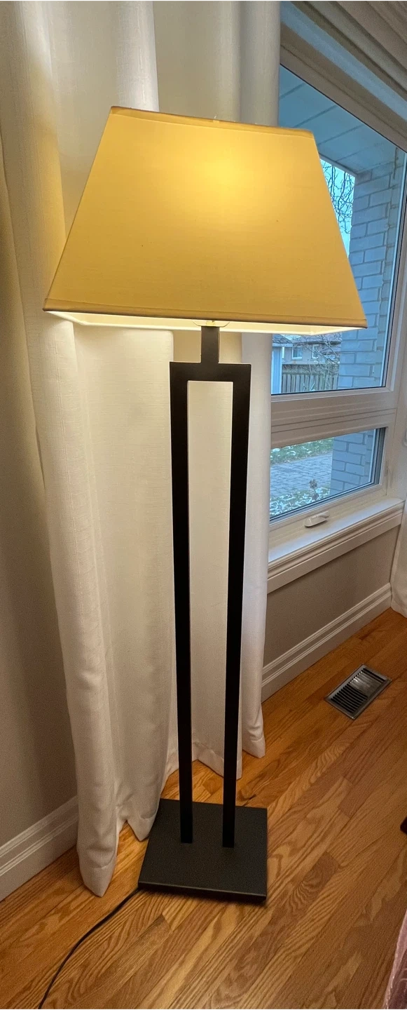 Used in excellent condition. Dark brown base with off-white rectangular shades. Shades give off warm glow. $40 for the set. Table lamp is 25” tall. Floor lamp is 60” tall.