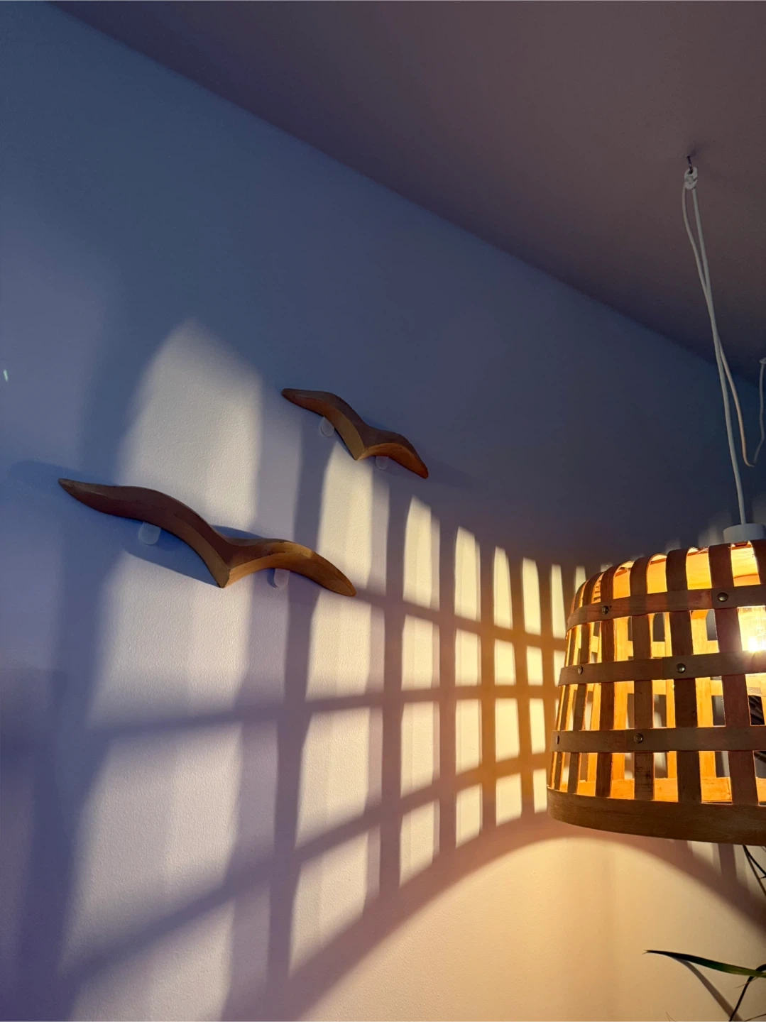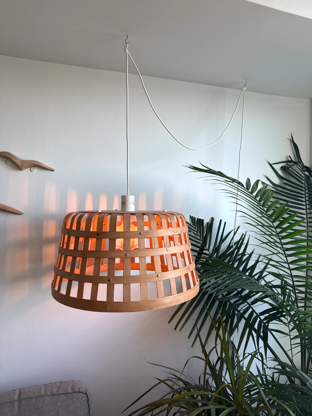 A stylish wooden basket pendant lamp. It casts a warm glow and creates nice shadow patterns on the walls. Perfect for adding a natural, cozy feel to any room! Lamp included!