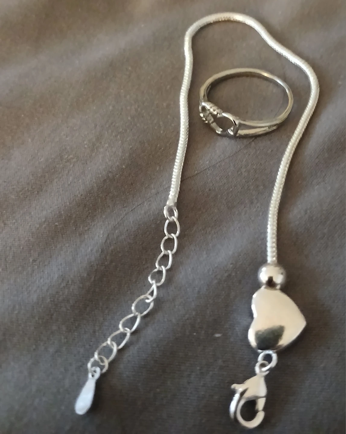 This is a silver tone braceley with a heart charm and an adjustable chain. It also includes a matching ring. The braceley has a lobster clasp closure. It's a lovely set for everyday wear!