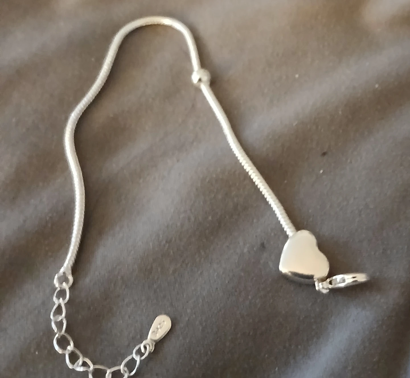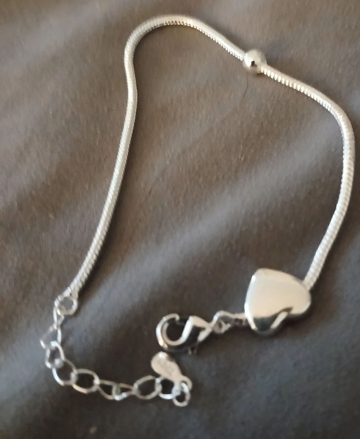 This is a silver tone braceley with a heart charm and an adjustable chain. It also includes a matching ring. The braceley has a lobster clasp closure. It's a lovely set for everyday wear!