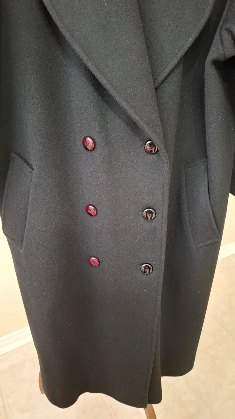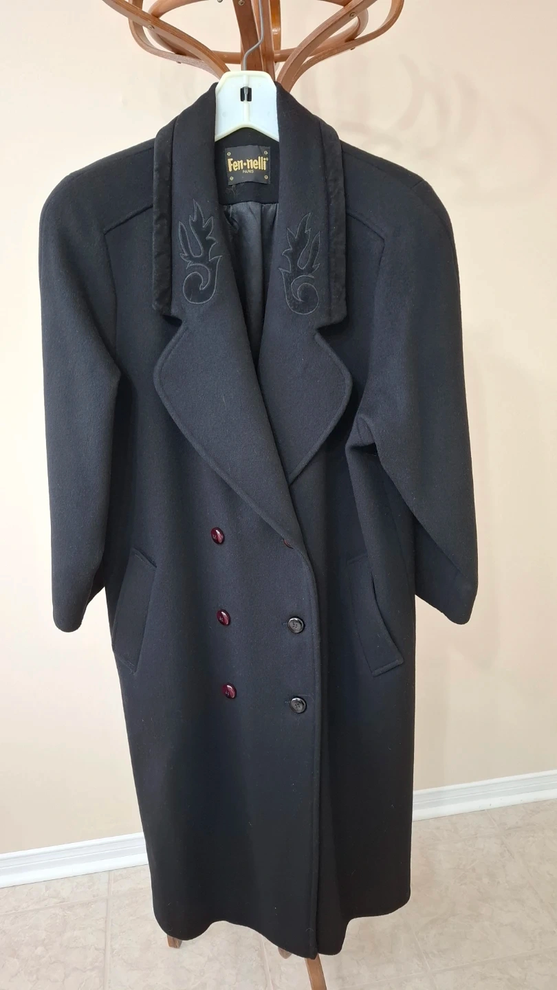 A stylish, vintage black double-breasted coat from Fen-nelli. Features decorative embroidery on the collar and deep pockets. Made with pure wool for warmth. Size 9-10.