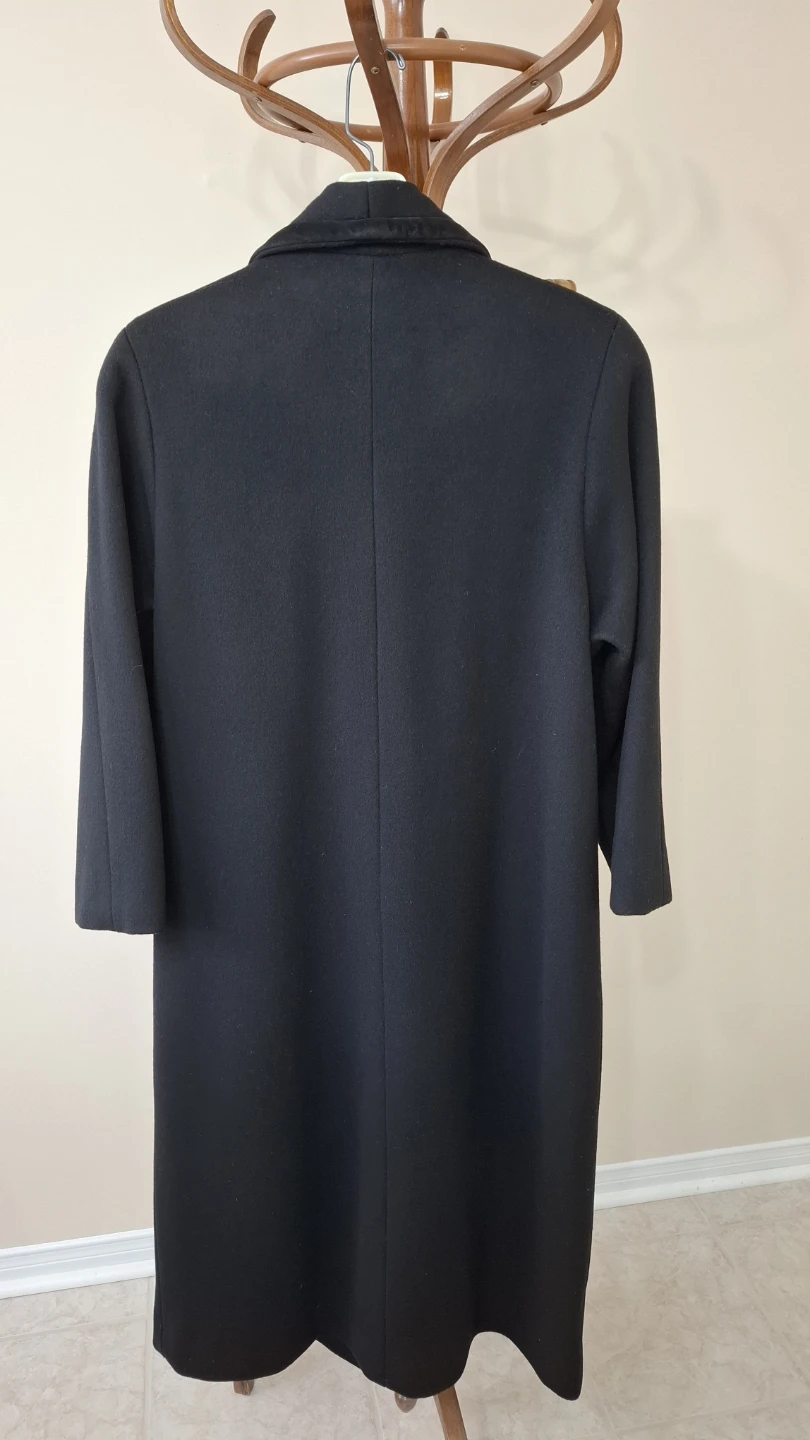 A stylish, vintage black double-breasted coat from Fen-nelli. Features decorative embroidery on the collar and deep pockets. Made with pure wool for warmth. Size 9-10.