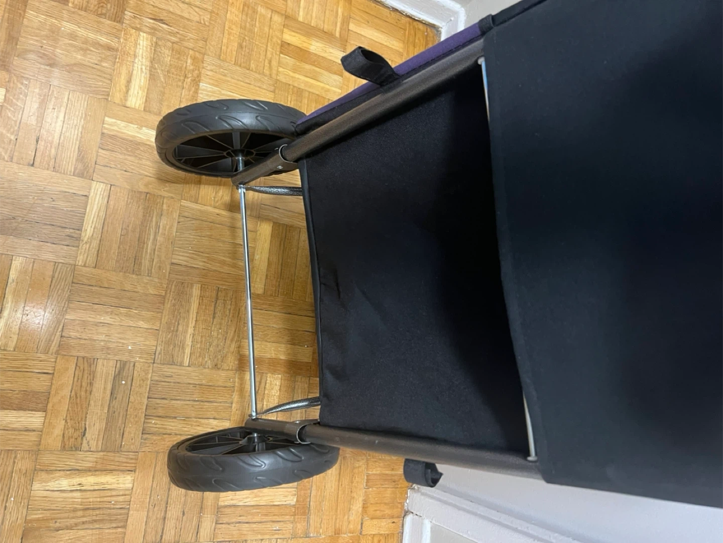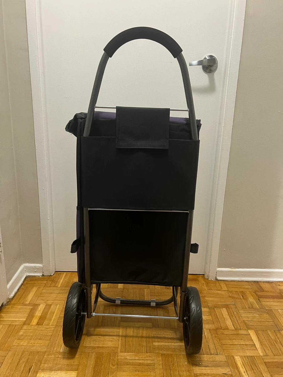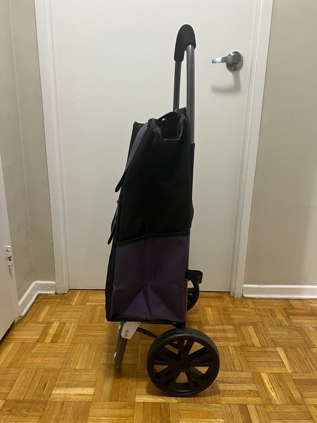 Selling a rolling shopping cart in great condition! It's super handy for groceries or carrying items around. The cart is black with purple accents and has a sturdy frame with wheels for easy transport. Perfect for anyone who needs a little extra help carrying things