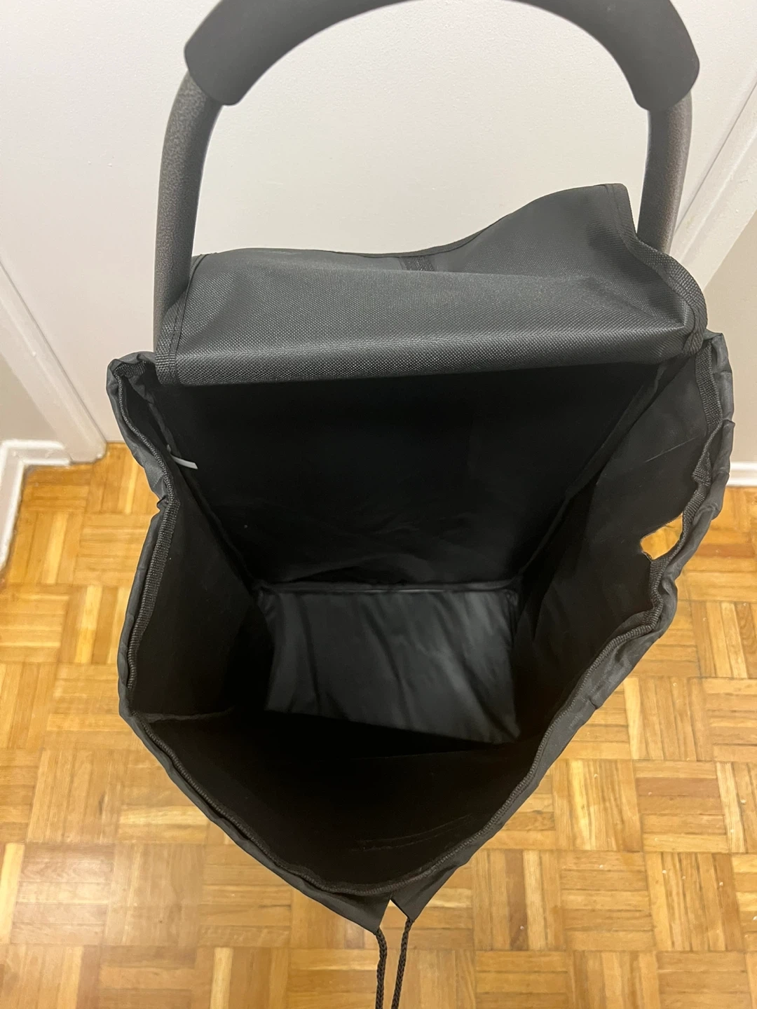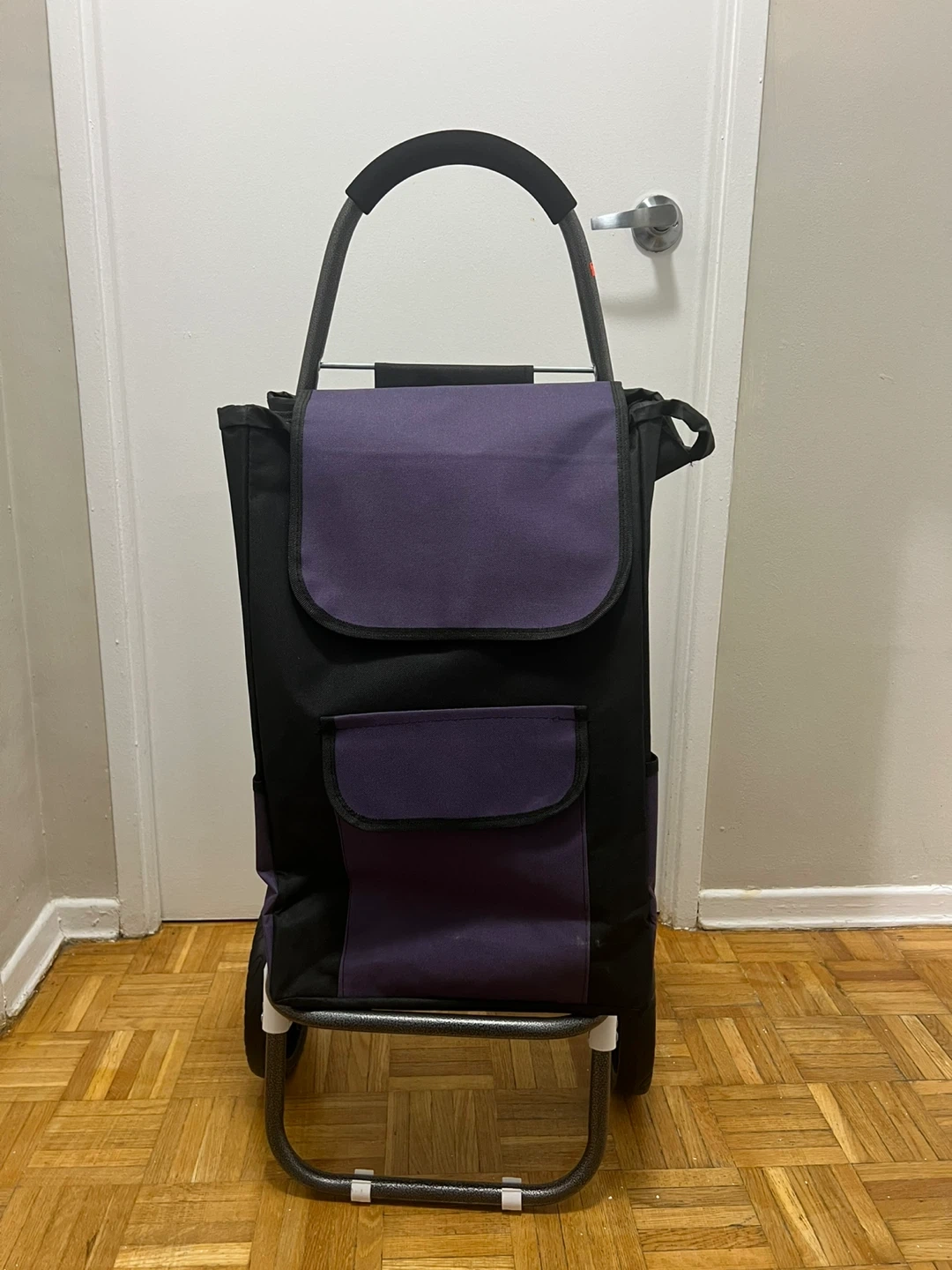 Selling a rolling shopping cart in great condition! It's super handy for groceries or carrying items around. The cart is black with purple accents and has a sturdy frame with wheels for easy transport. Perfect for anyone who needs a little extra help carrying things