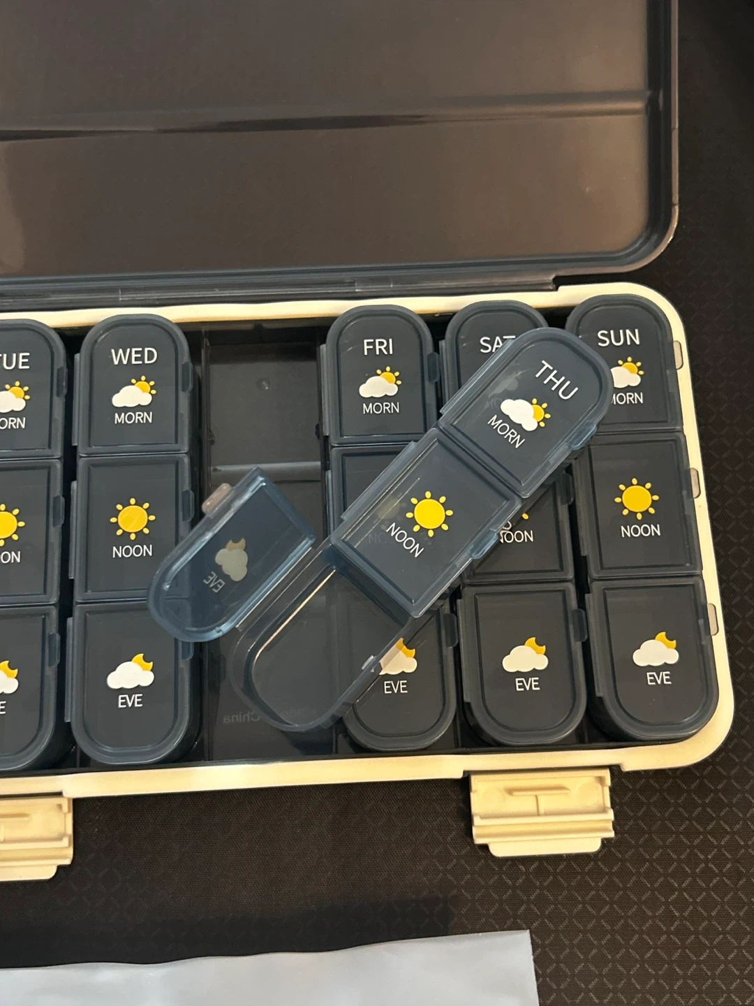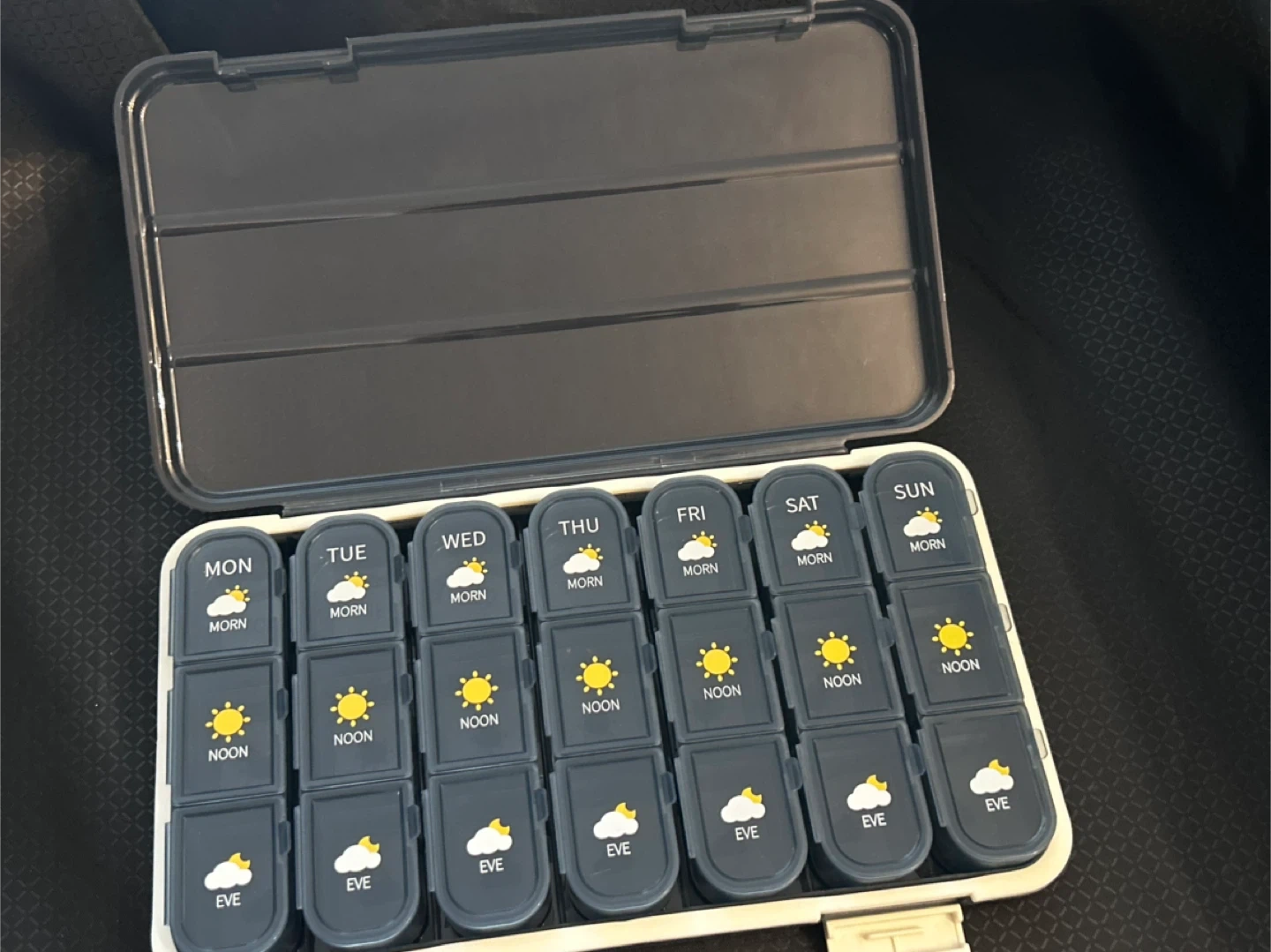 Keep your pills organized with this weekly pill organizer case! It has compartments for morning, noon, and evening for each day of the week.