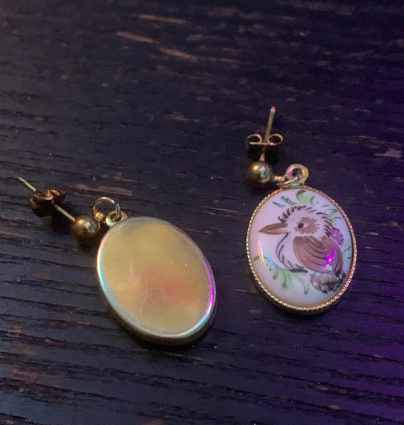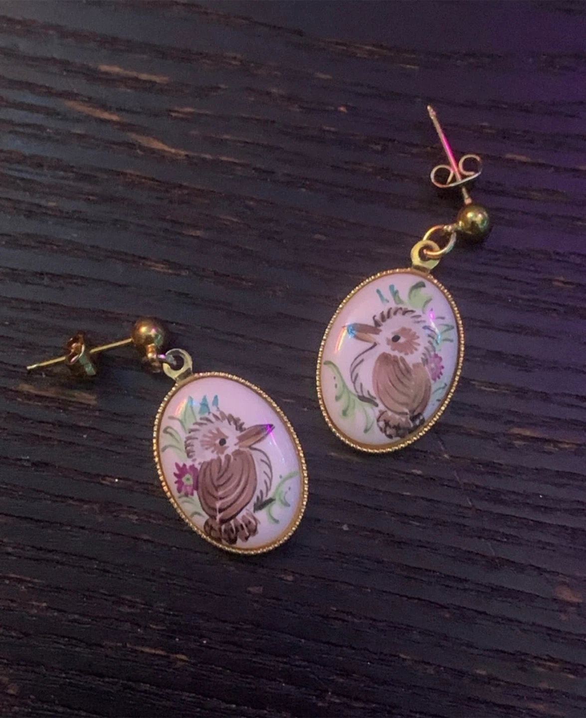 Charming oval earrings featuring a hand-painted kookaburra design. Gold-toned metal with post backings. These would make a sweet gift for any bird lover!