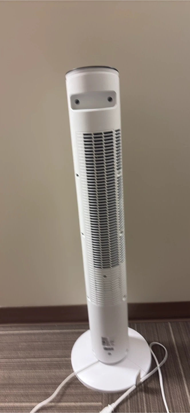 100cm/39in tall. Includes a remote control, it has multiple fan speed settings and a timer function up to 4 hours. Fits well in any room.