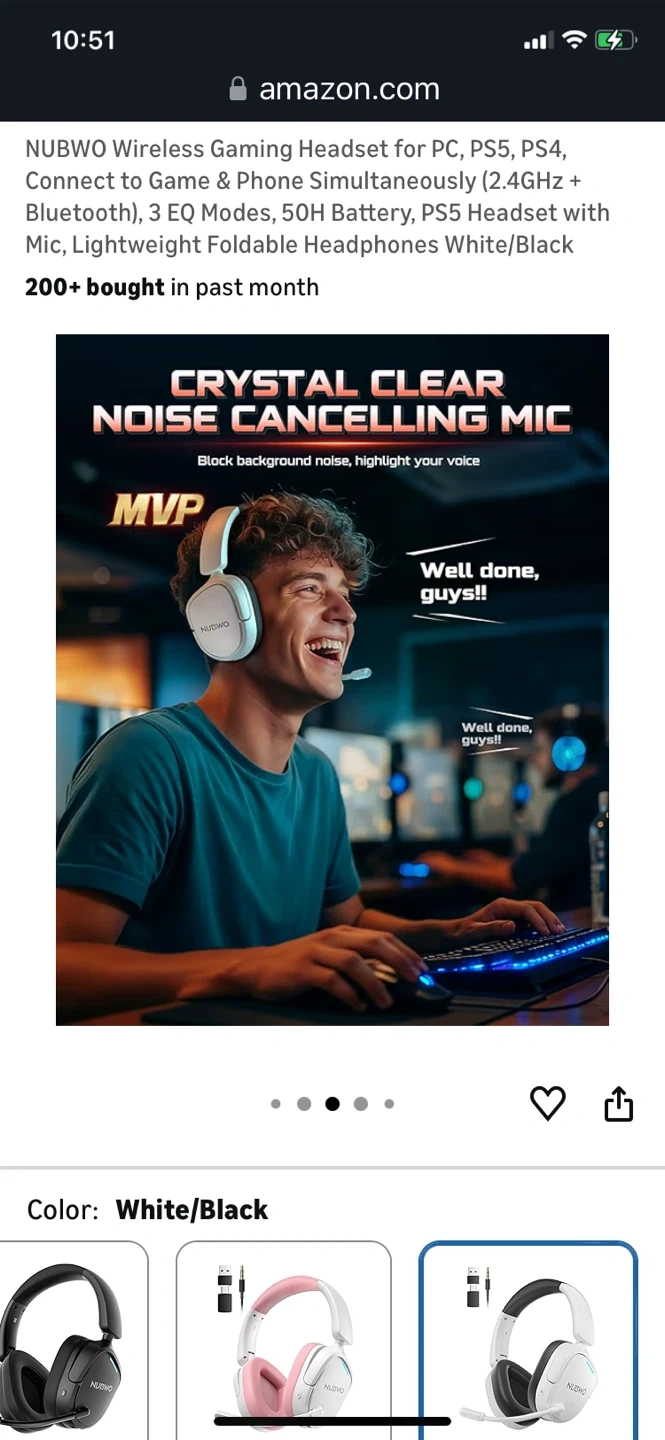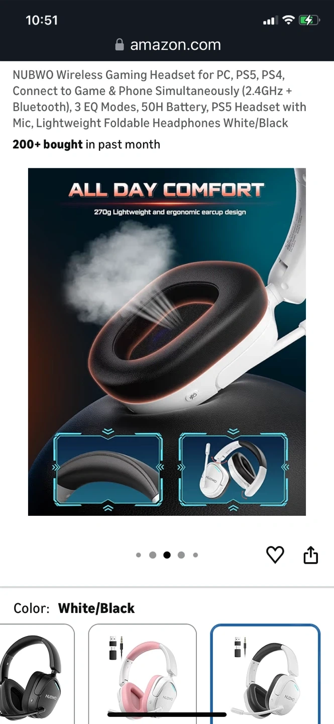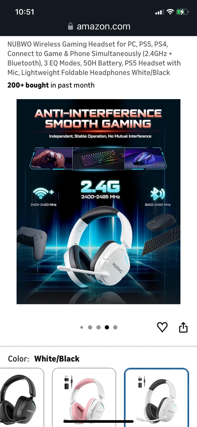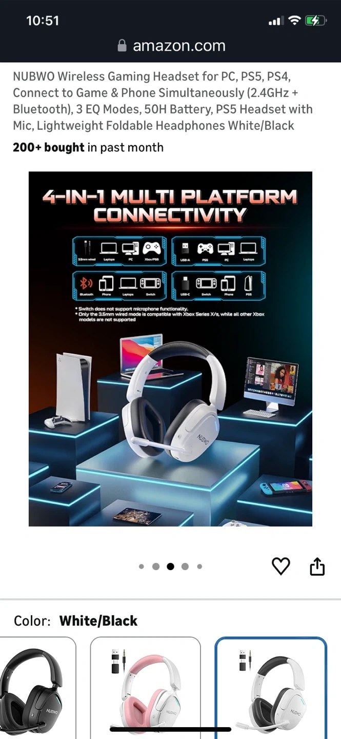 This NUBWO wireless gaming headset connects to PC, PS5, and PS4 via 2.4GHz and Bluetooth. It features 3 EQ modes and a 50H battery. The headset is lightweight and foldable for comfort.