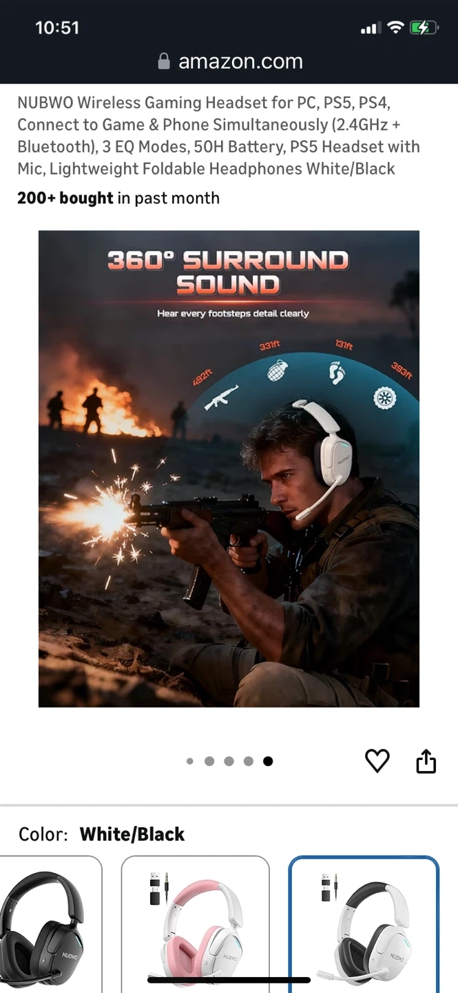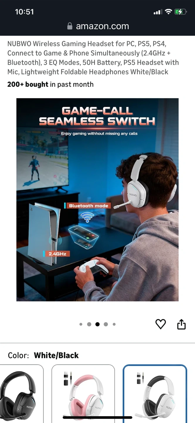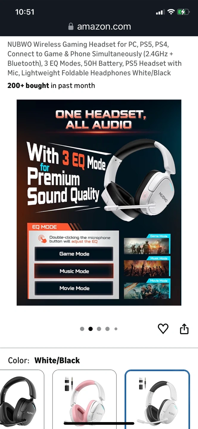 This NUBWO wireless gaming headset connects to PC, PS5, and PS4 via 2.4GHz and Bluetooth. It features 3 EQ modes and a 50H battery. The headset is lightweight and foldable for comfort.