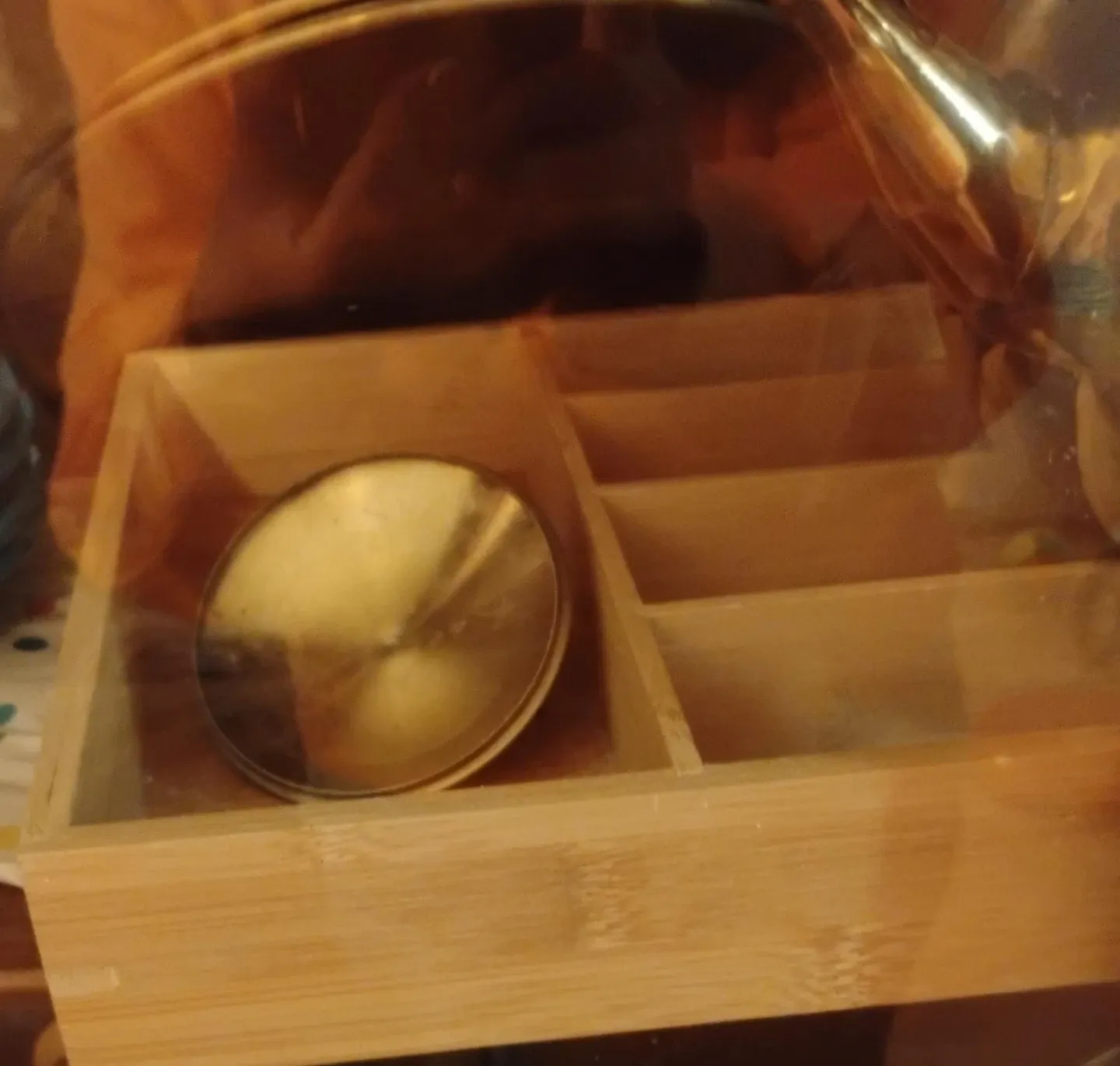 This bamboo organizer box features multiple compartments for storage. It's made of bamboo. The circular insert is made of metal.