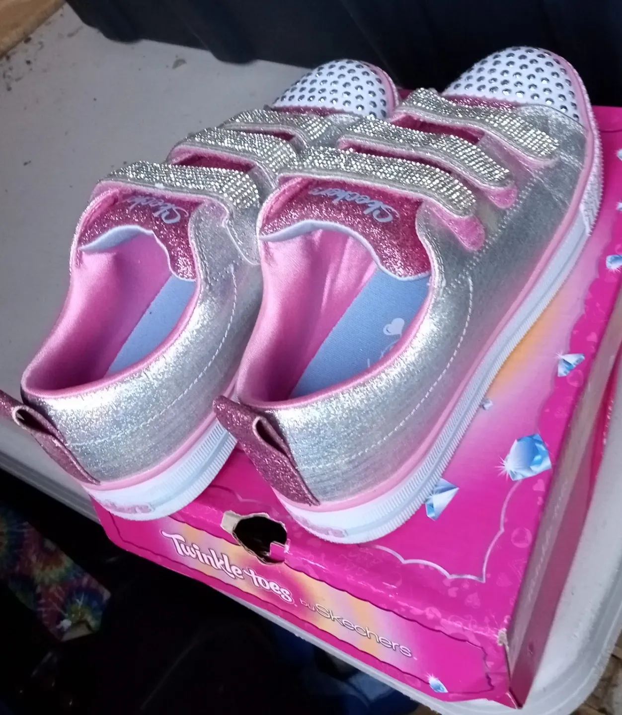 Sparkly silver and pink Skechers Twinkle Toes sneakers for girls. Features velcro straps for easy on and off. Comes with the original box.